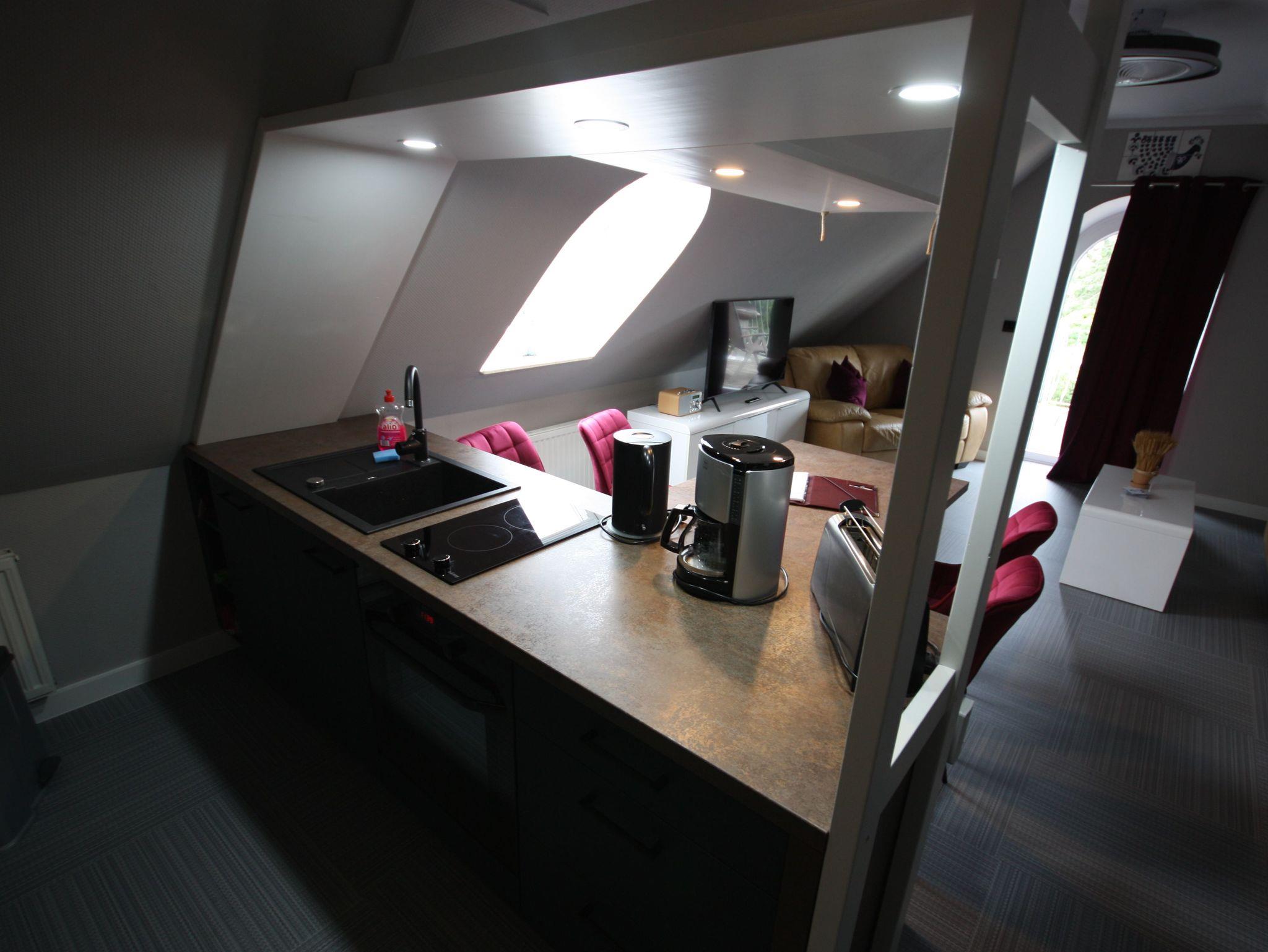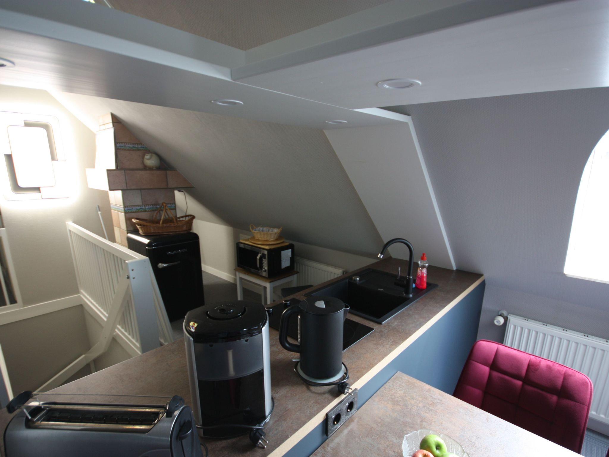 • Einbauküche mit Spülmaschine, Backofen, Mikrowelle, Wasserkocher, Kaffeemaschine, etc.
