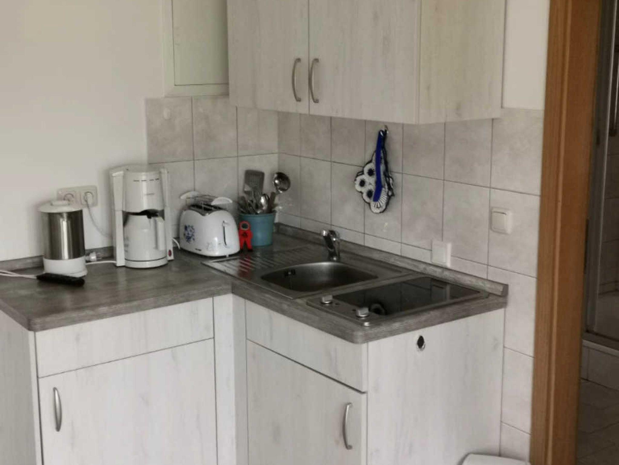 Wohnzimmer mit Doppelbett, Flachbildfernseher, Miniküche mit Kühlschrank, Kaffeemaschine, Wasserkocher, Toaster,