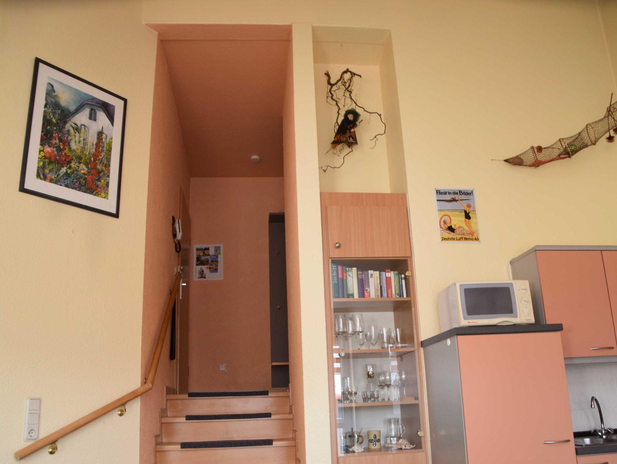 Die Ferienwohnung liegt im Dachgeschoss des Ferienhauses. Sie besteht aus Wohnzimmer mit Küchenzeile, Schlafzimmer und Tageslichtbad.
