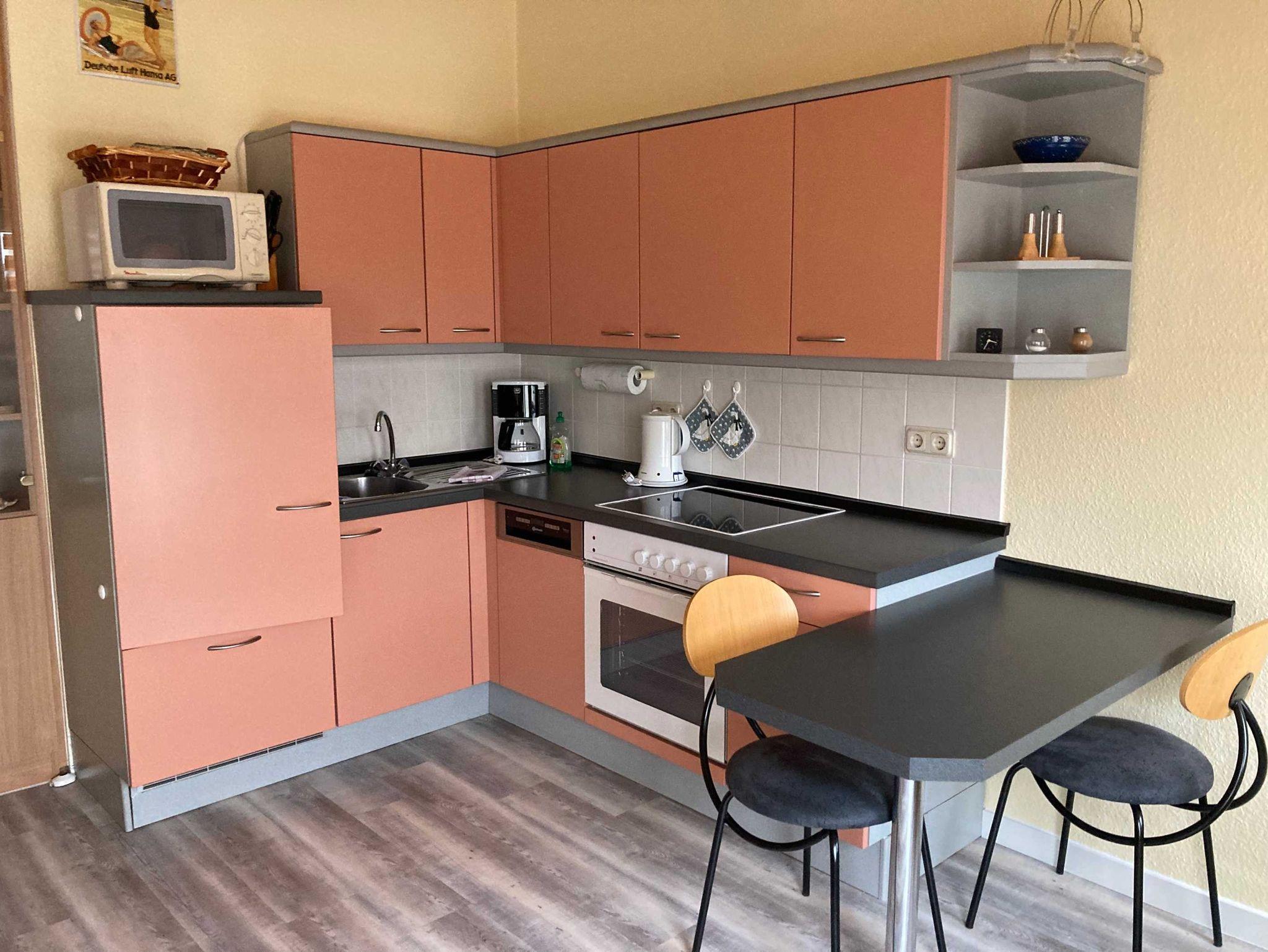 Die Ausstattung der Einbauküche ist funktional und qualitativ hochwertig unter anderem mit Toaster, Kaffeemaschine, Herd, Cerankochfeld, Geschirrspüler, Gefrierfach. Große West-Dachterrasse mit Blick auf die Dächer von Koserow.