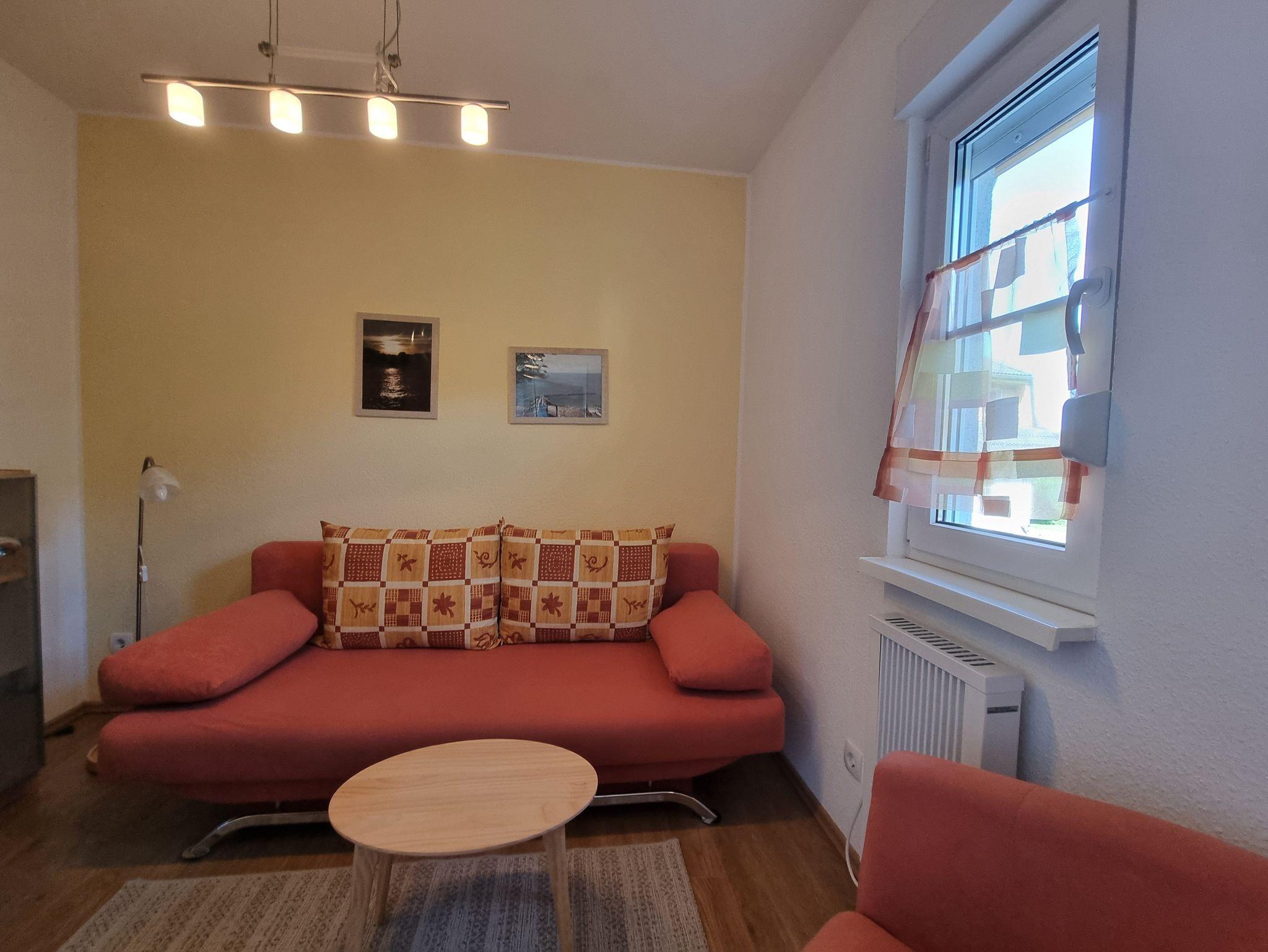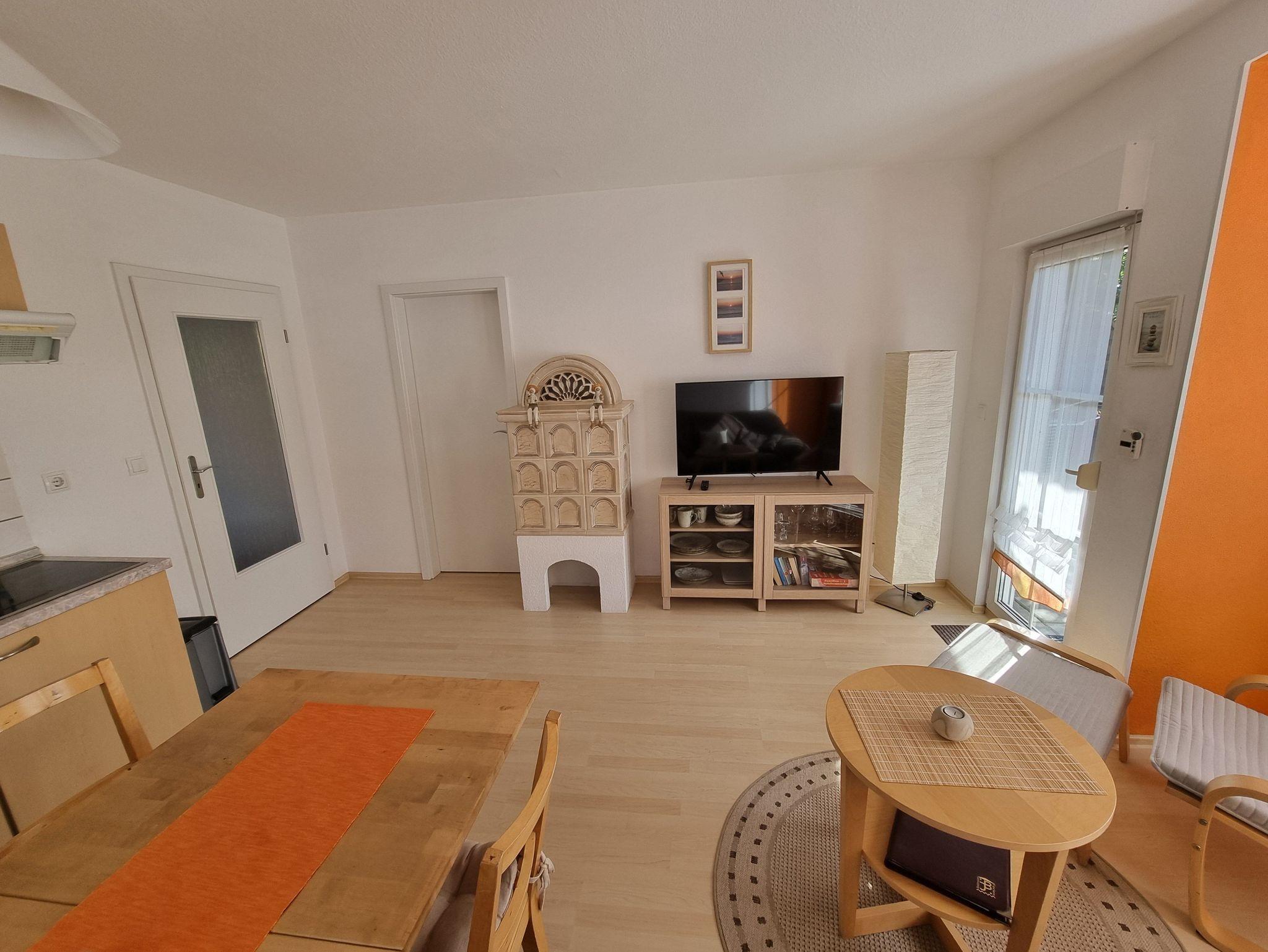 Die Ferienwohnung ist im Wohnbereich ausgestattet mit einer gemütlichen Couch und einer offenen Küche mit Essbereich. Die Südterrasse lädt zum Entspannen ein.