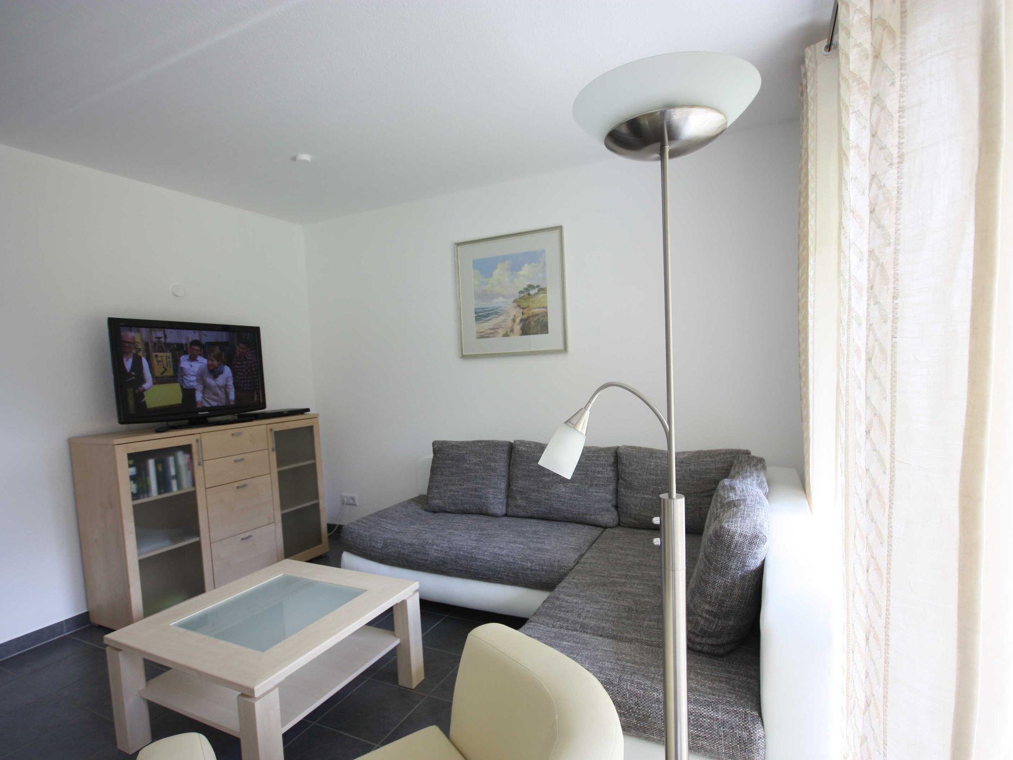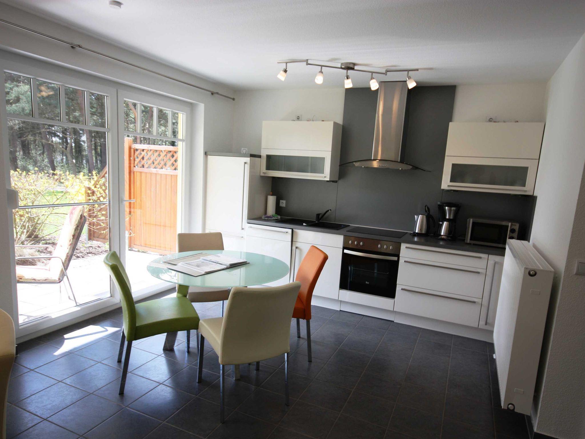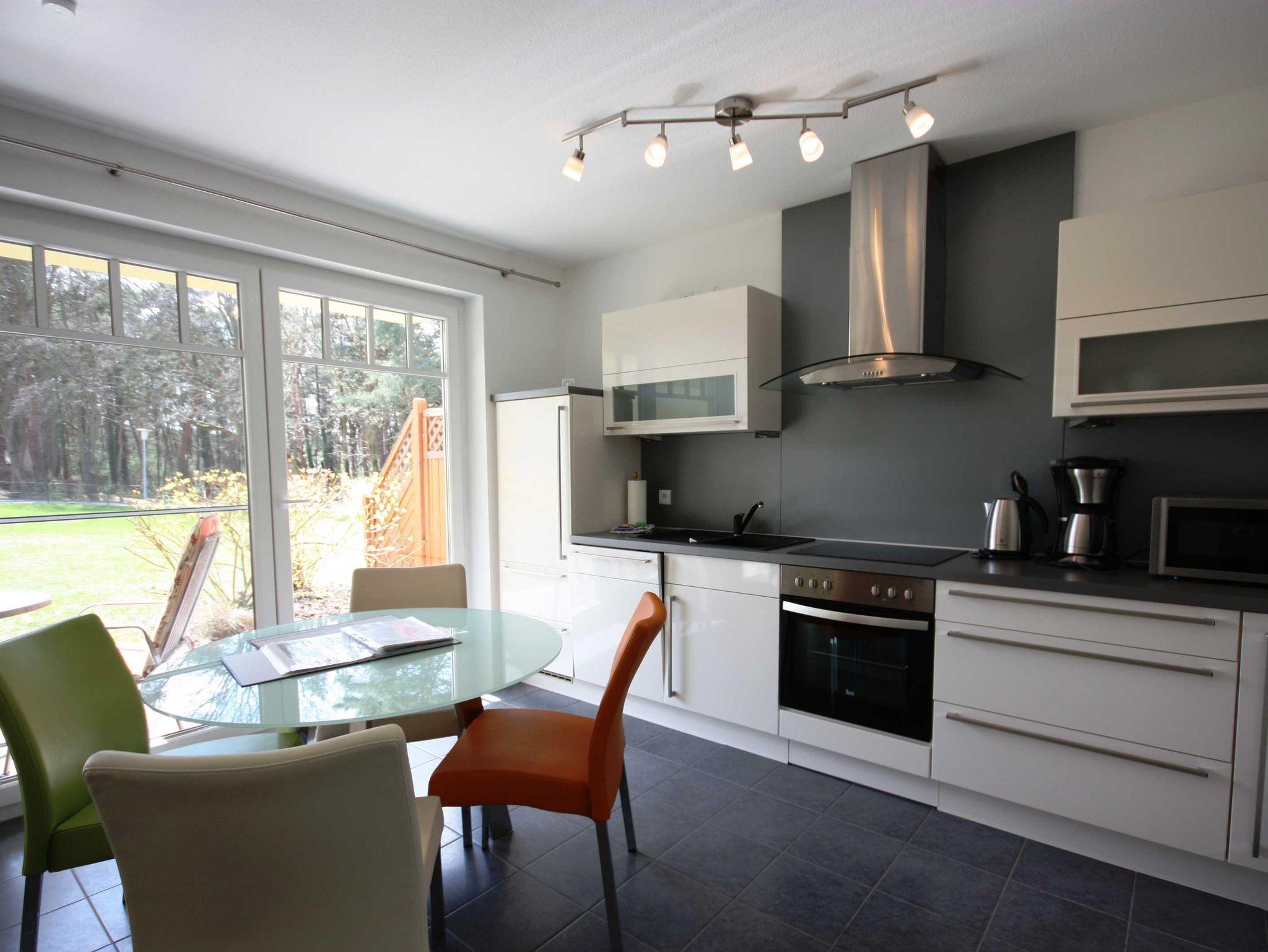 Die Ferienwohnung liegt im Erdgeschoß des Ferienhauses. Sie besteht aus Wohnzimmer, kompl. ausgestatteter Küche, Schlafzimmer und Tageslichtbad. Die Ausstattung der Einbauküche ist neuwertig funktional und qualitativ hochwertig unter anderem mit Toaster, Kaffeemaschine, Backofen, Kochfeld, Geschirrspüler, Gefrierfach. Große Süd-Terrasse mit Blick auf den Küstenwald, große Spielwiese.
