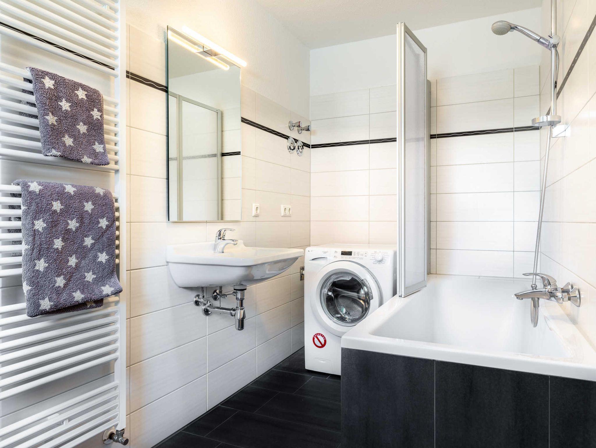 Die separate Küche ist umfangreich ausgestattet und verfügt über einen Geschirrspüler, 4- Platten Ceranherd, Backofen, Kühlschrank mit Gefrierfach, Mikrowelle, Kaffeemaschine und Wasserkocher sowie Esstisch. Das Bad ist mit Badewanne, WC und Waschmaschine ausgestattet.