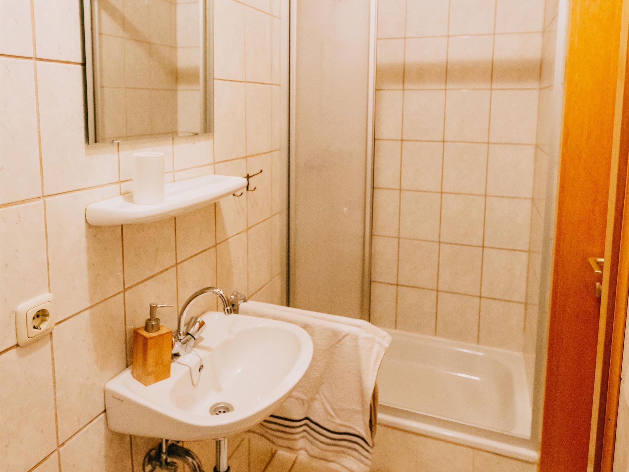 Das Badezimmer mit Dusche, WC und Fön runden das Gesamtbild sich ab.