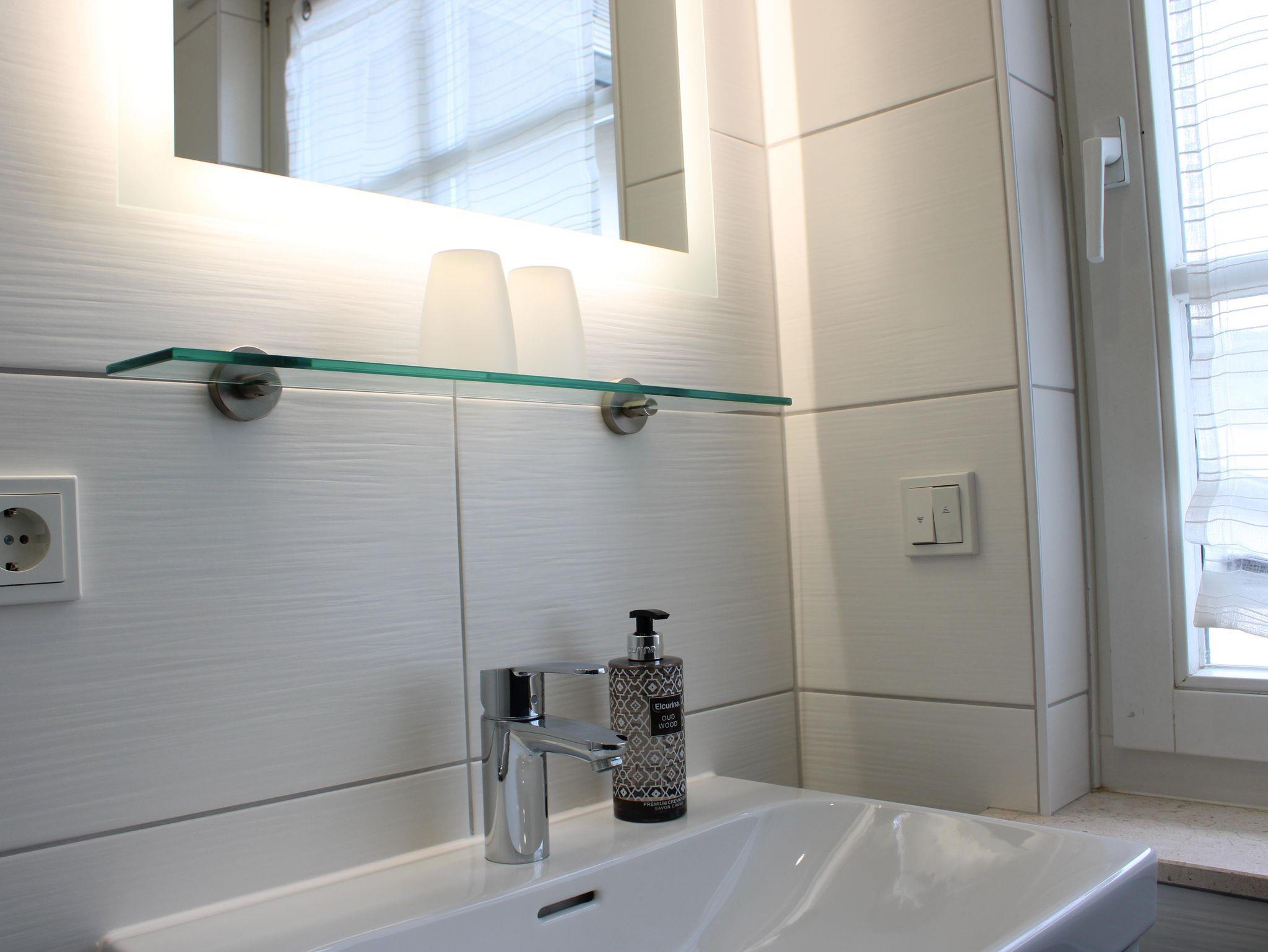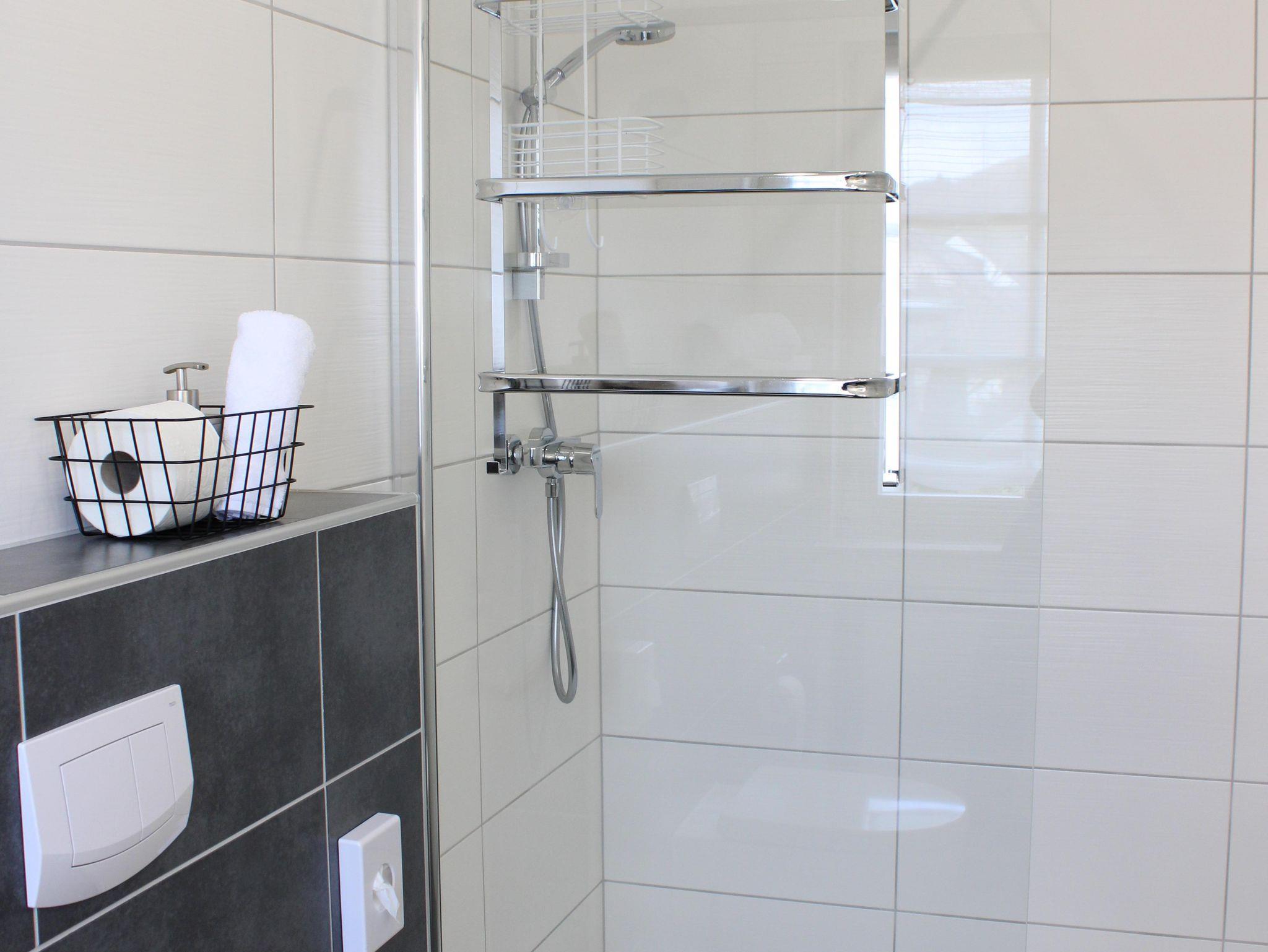 Das Badezimmer ist komfortabel eingerichtet und verfügt mit Dusche, Toilette, Föhn, Kosmetikspiegel, Handtücher und verschiedenen Kosmetikartikeln über eine hochwertige Ausstattung.
