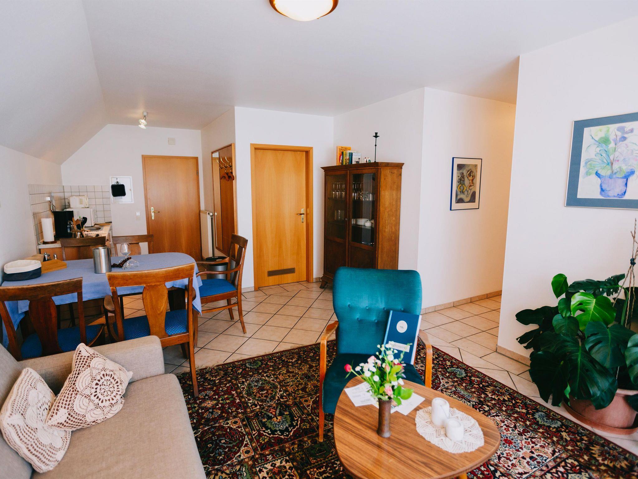 Eine große Ferienwohnung mit ca. 60m² für 2-6 Personen; zwei Schlafzimmer, eines mit Doppelbett und eines mit zwei Einzelbetten. Im großen Wohnzimmer mit integrierter Küche können zwei weitere Personen auf der gemütlichen Doppel-Schlafcouch übernachten. Der Balkon bietet Ihnen einen herrlichen Blick auf die Weinberge und Moselhöhen.