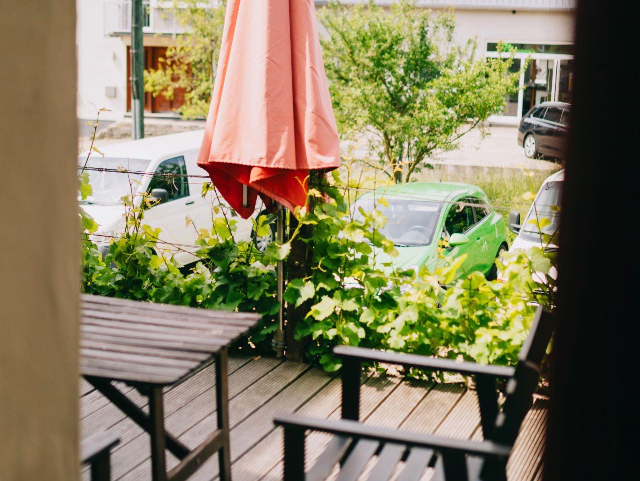Diese moderne Wohnung mit 55m² hat ein großes Schlafzimmer mit Doppelbett und ein Badezimmer mit Badewanne und Dusche. Gleich bei dem geräumigen Wohnraum mit integrierter Küchenzeile (Spülmaschine, Ofen) befindet sich eine große Sonnenterrasse mit herrlichem Blick auf die Weinberge.