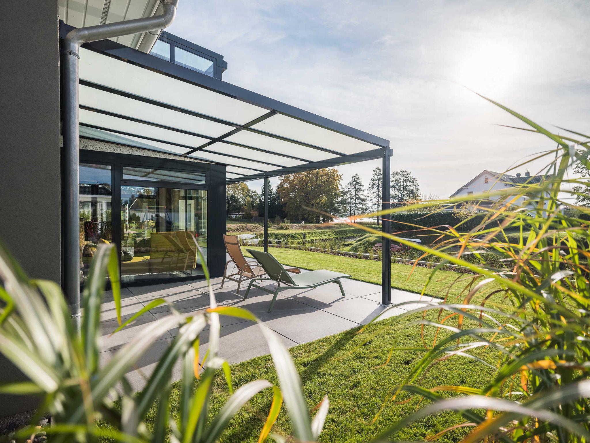 Gartentisch mit 4 Stühlen, Gasgrill, überdachter Terrassenbereich, 2 Sonnenliegen