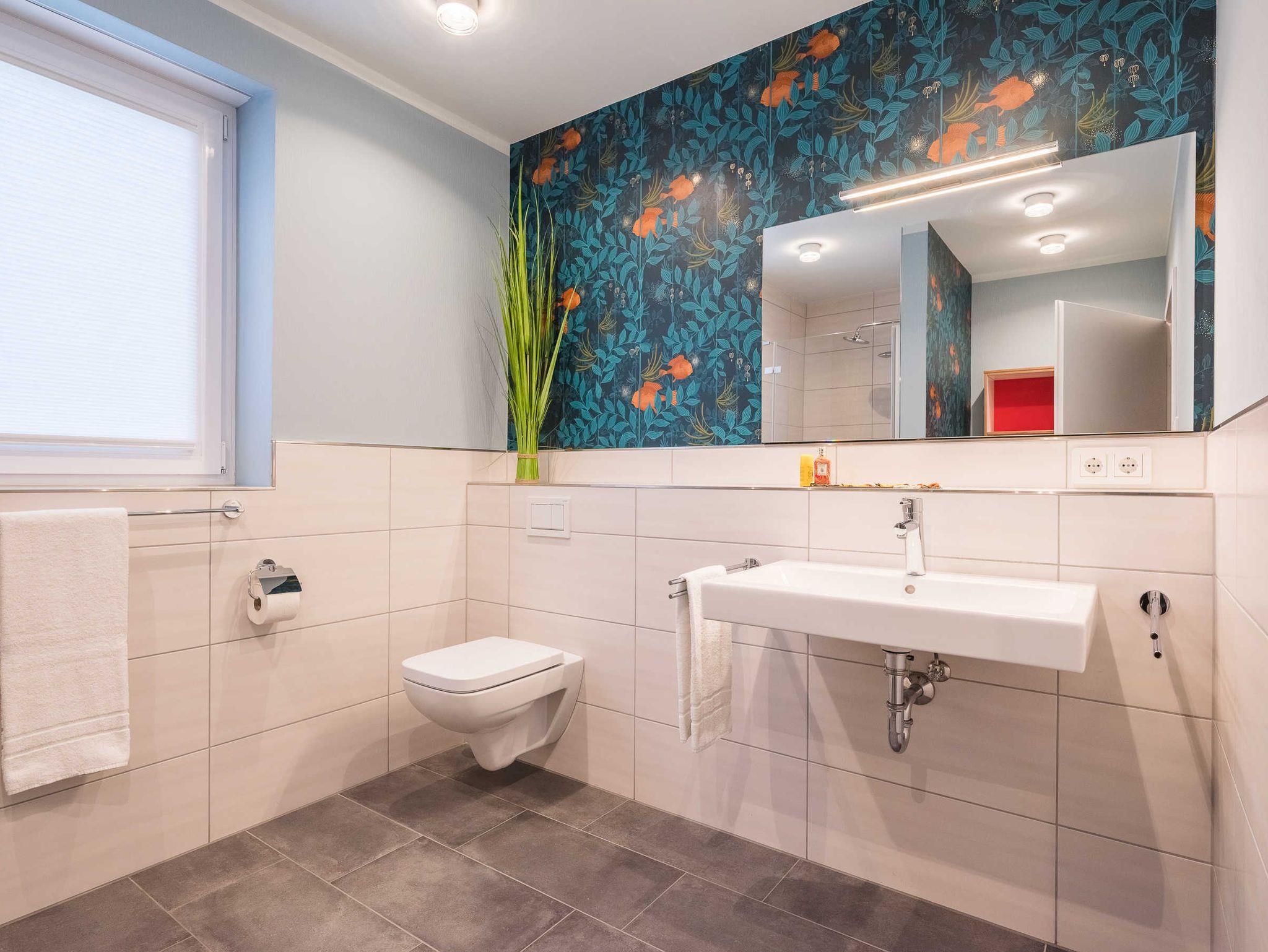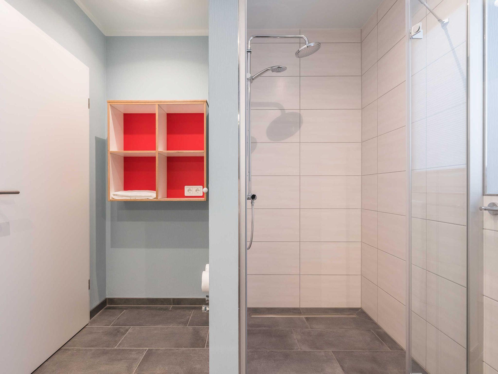 große, ebenerdige Dusche, Handtuchtrockner, WC, Waschtisch, Föhn