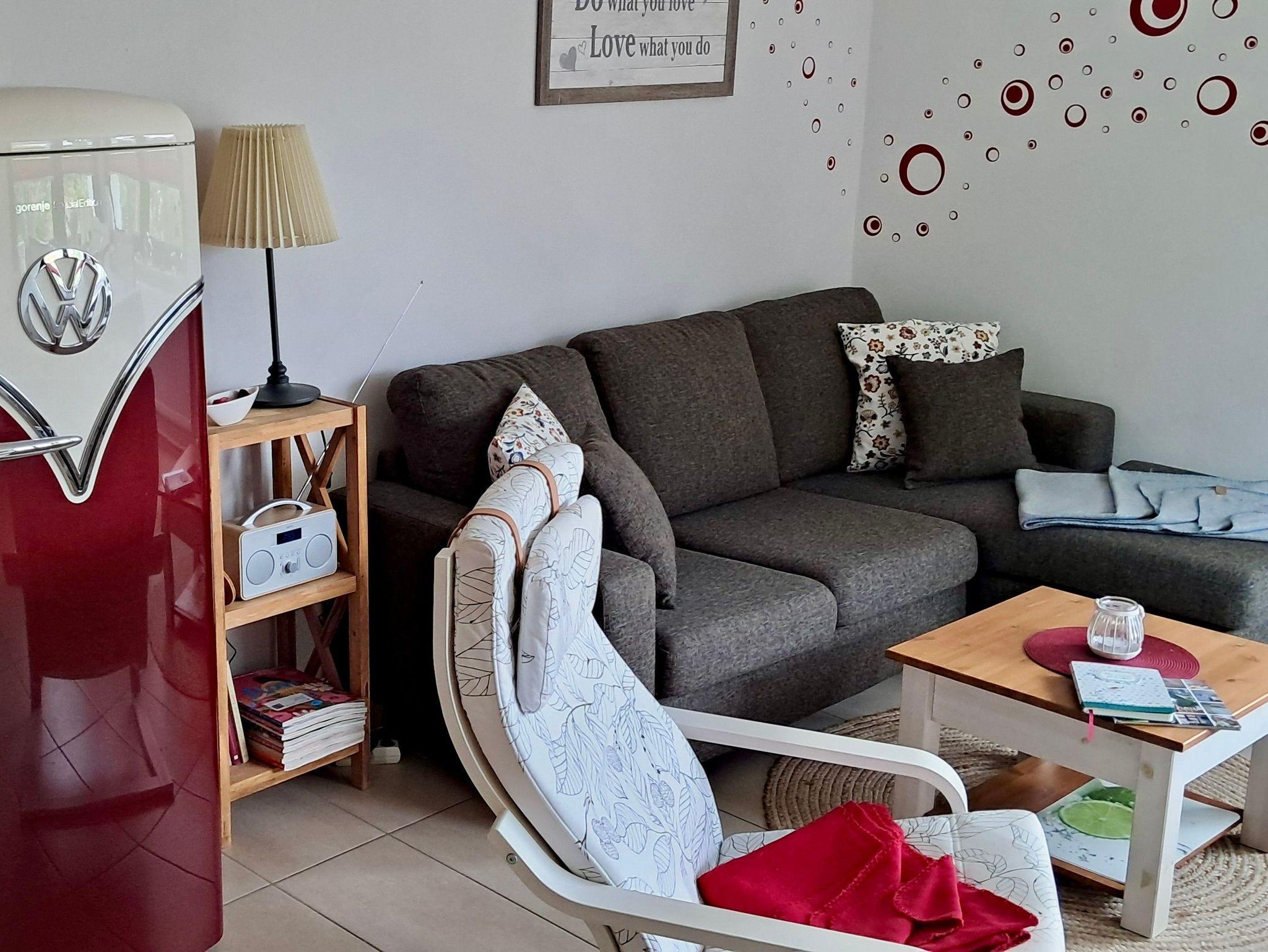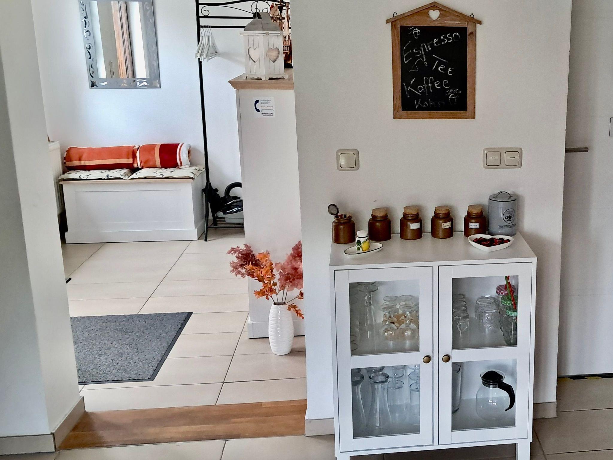 Im Eingangsbereich befinden sich Schuhregal, Garderobe, Spiegel und Wäscheschrank. Weiterhin stehen den Gästen bereits im Eingangsbereich zahlreiche Informationsblätter für Ausflüge an der Pinnwand zur Verfügung. Der Wohn-/ Essbereich verfügt über einen gemütlichen Esstisch mit vier Stühlen, Ecksofa, Couchtisch, kleinem Teppich in der Couchecke, Regalschrank, TV- Gerät und einen Kaminofen.