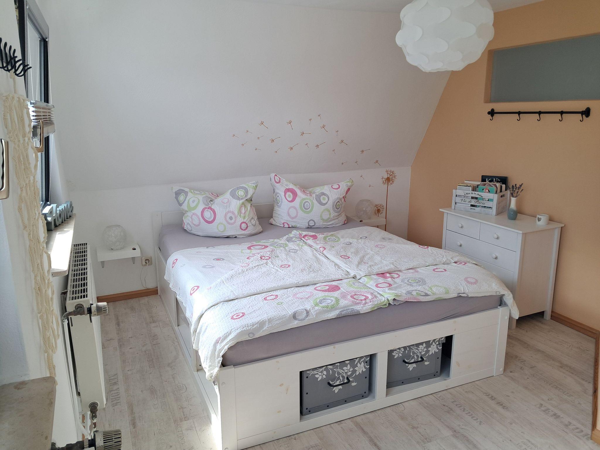 Das Obergeschoss: hier befindet sich ein Schlafzimmer mit Doppelbett (160 x 200 m), zwei Nachttischregalen mit Leselampe, Kommode, offenes Kleiderregal mit Kleiderbügeln sowie eine Leseecke.