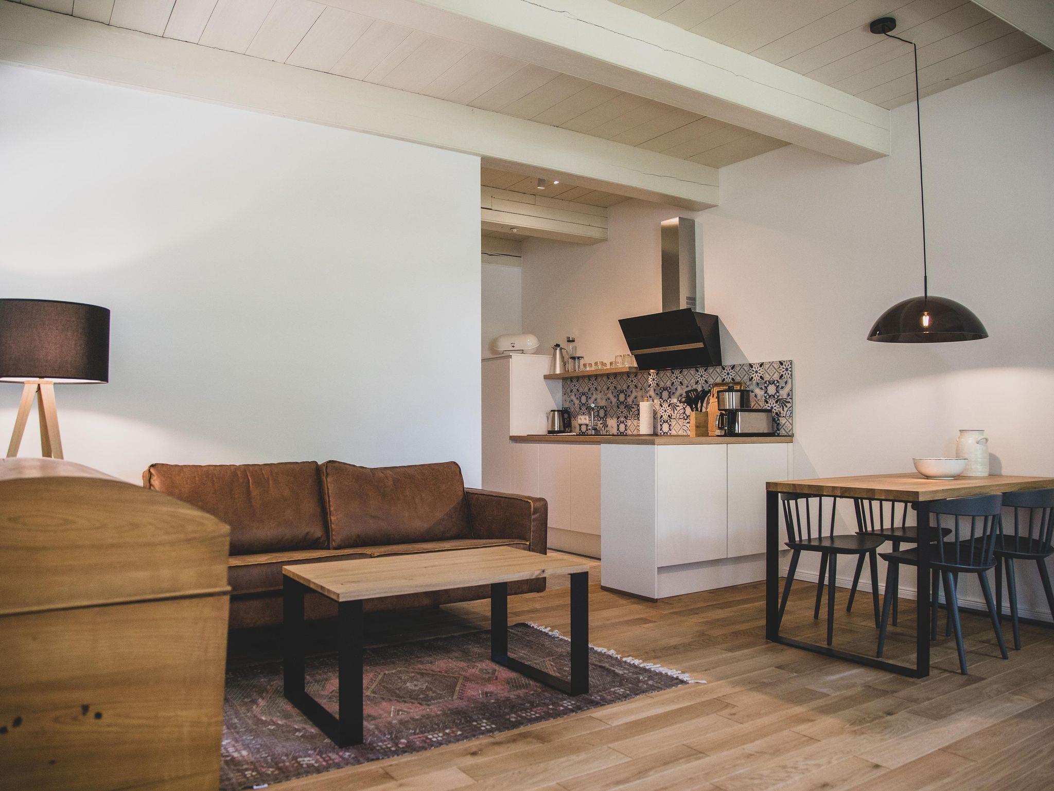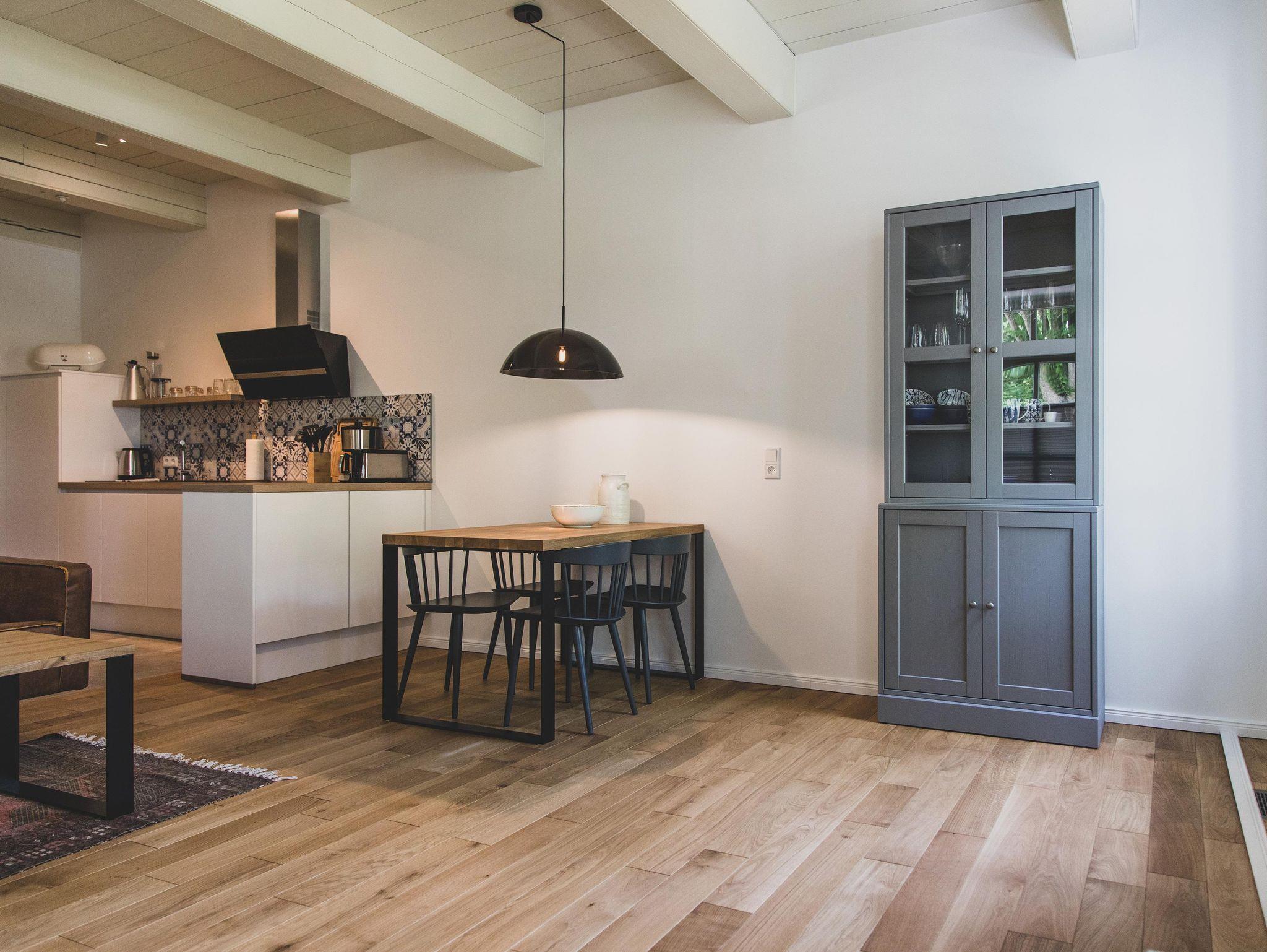 Unsere Wohnungen im Vorderhaus des Ferienhofs verfügen über hohe Decken mit durchgehend erhaltenen alten Deckenbalken. Die historischen Blockrahmenfenster und Fensterläden wurden in Handarbeit neu erstellt und runden den Anblick des denkmalgeschützten Gulfhofs ab. Im ehemaligen Scheunentrakt befinden sich durch bodentiefe Fenster helle und großzügig geschnittene Wohnungen. Alle Ferienwohnungen sind individuell, modern und mit viel Liebe zum Detail eingerichtet und bieten von der Terrasse einen erholsamen Blick auf die Grünflächen mit altem Baumbestand.