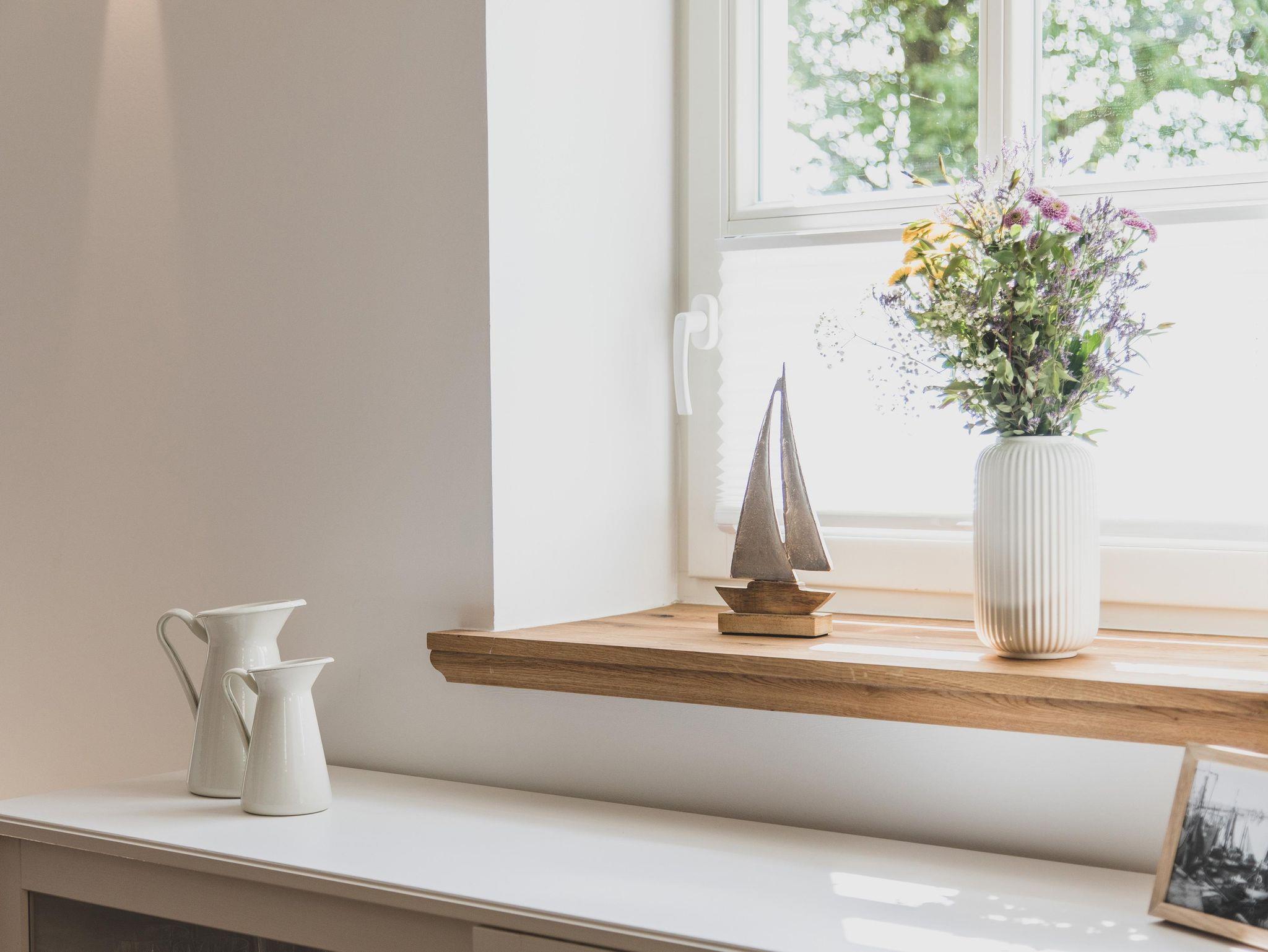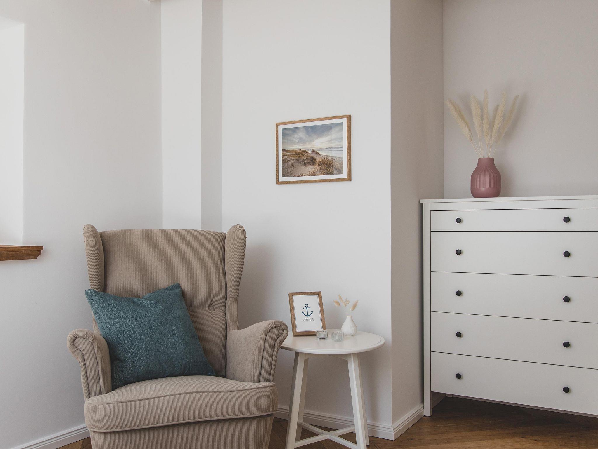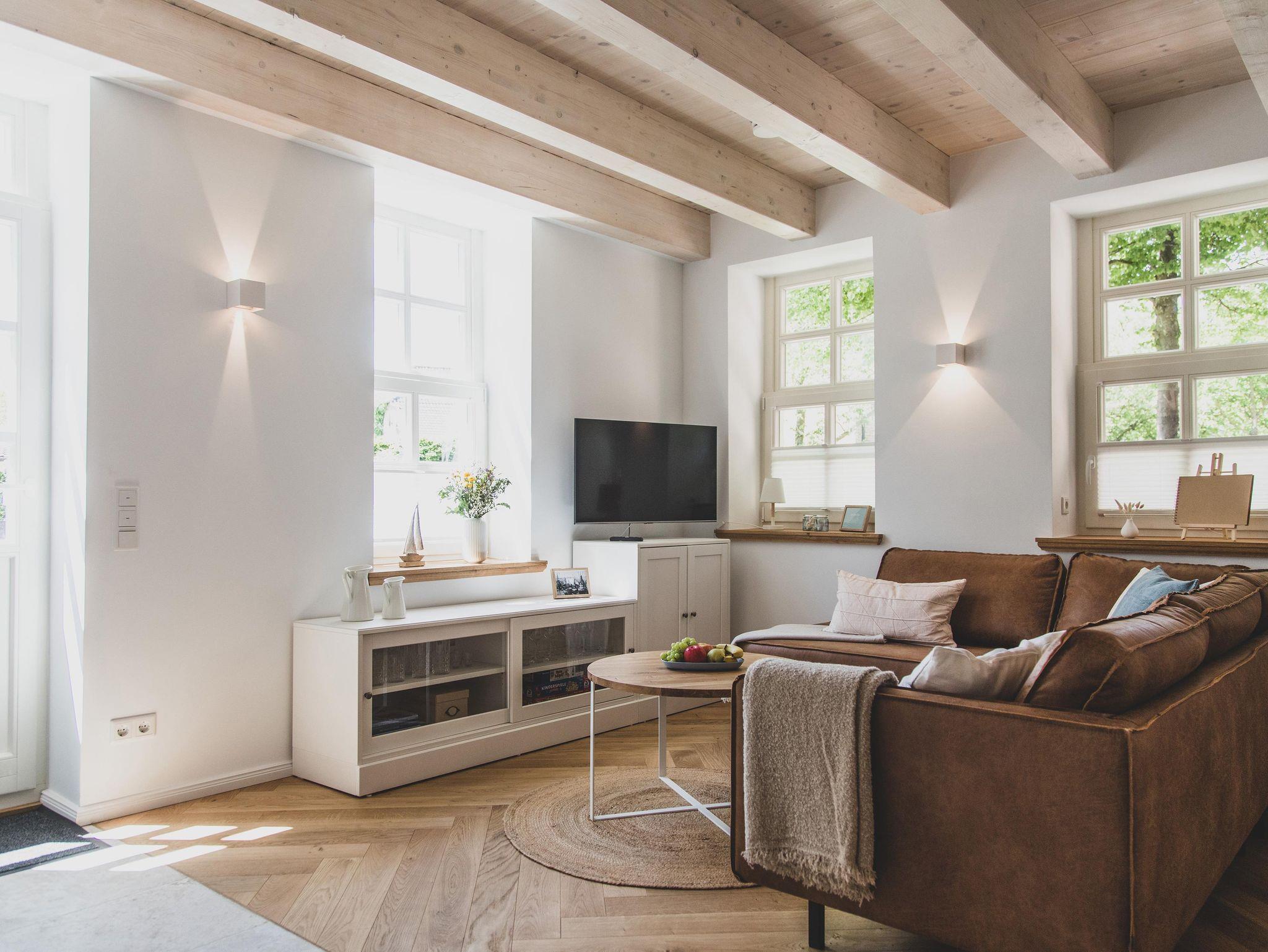 Unsere Wohnungen im Vorderhaus des Ferienhofs verfügen über hohe Decken mit durchgehend erhaltenen alten Deckenbalken. Die historischen Blockrahmenfenster und Fensterläden wurden in Handarbeit neu erstellt und runden den Anblick des denkmalgeschützten Gulfhofs ab. Im ehemaligen Scheunentrakt befinden sich durch bodentiefe Fenster helle und großzügig geschnittene Wohnungen. Alle Ferienwohnungen sind individuell, modern und mit viel Liebe zum Detail eingerichtet und bieten von der Terrasse einen erholsamen Blick auf die Grünflächen mit altem Baumbestand.