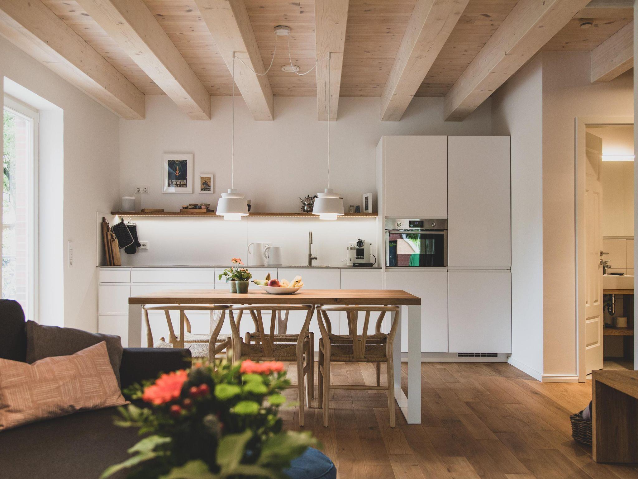 Unsere Wohnungen im Vorderhaus des Ferienhofs verfügen über hohe Decken mit durchgehend erhaltenen alten Deckenbalken. Die historischen Blockrahmenfenster und Fensterläden wurden in Handarbeit neu erstellt und runden den Anblick des denkmalgeschützten Gulfhofs ab. Im ehemaligen Scheunentrakt befinden sich durch bodentiefe Fenster helle und großzügig geschnittene Wohnungen. Alle Ferienwohnungen sind individuell, modern und mit viel Liebe zum Detail eingerichtet und bieten von der Terrasse einen erholsamen Blick auf die Grünflächen mit altem Baumbestand.