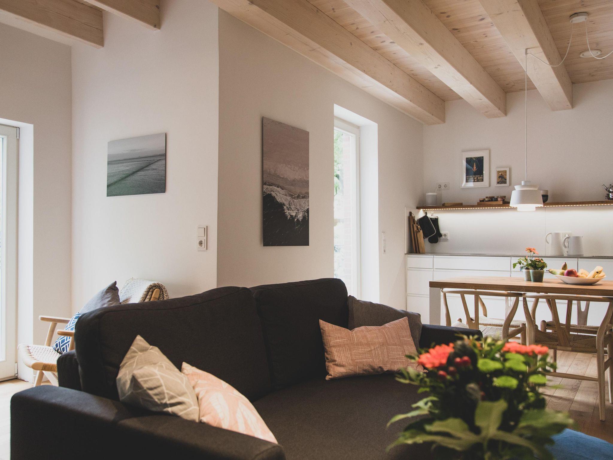 Die moderne und umfangreich ausgestattete Küche ist mit einem Bora-Kochfeld, Backofen/Mikrowelle, Geschirrspüler und einem großen Kühlschrank ausgestattet. Kochliebhaber können sich voll entfalten. Für diejenigen, die statt eines Ostfriesentees lieber frischen Kaffee bevorzugen, steht eine Nespressomaschine nebst Milchaufschäumer zur Verfügung.