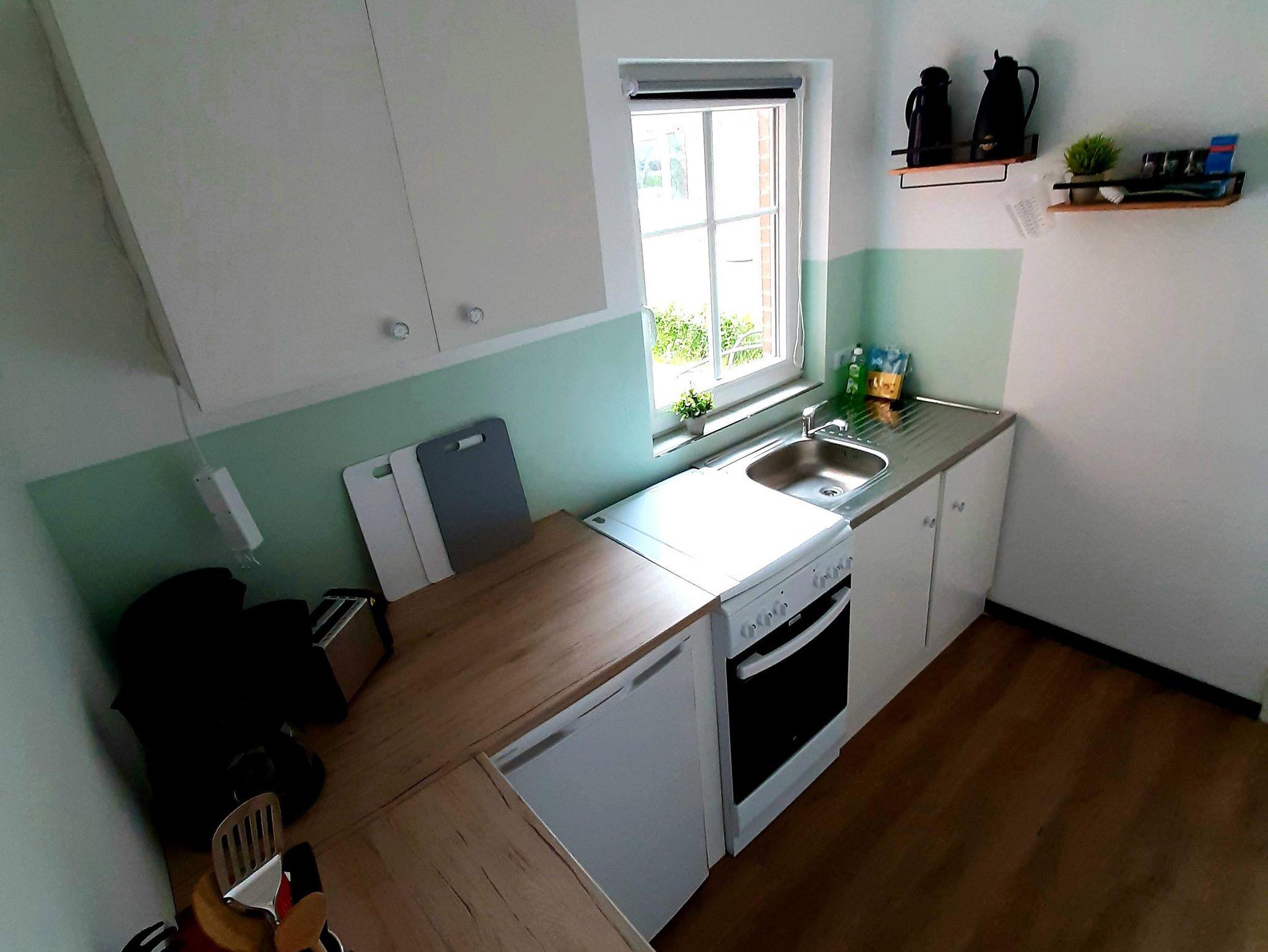 Küche mit Herd/Backofen, Kaffeemaschine, Toaster, Wasserkocher, Kühlschrank (ohne Gefrierfach)