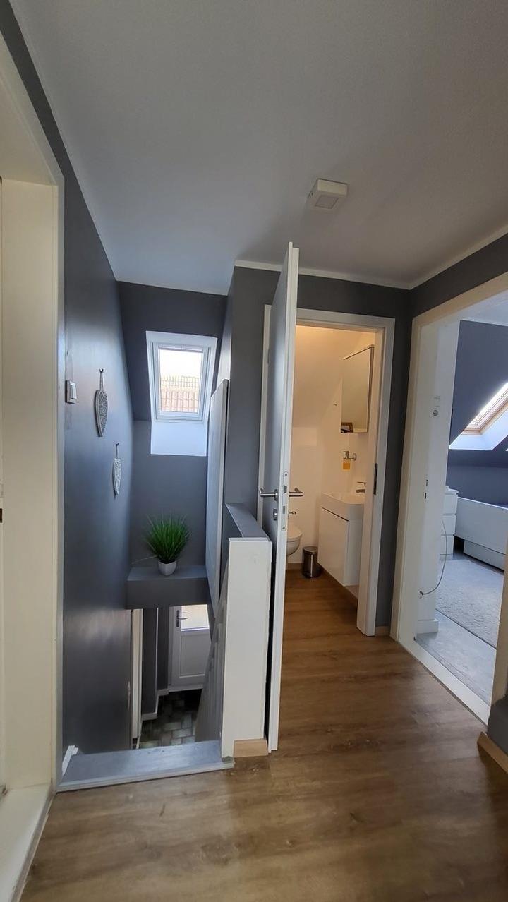 Unten befindet sich das Badezimmer mit einer Walk-in-Dusche und separatem WC gleich daneben. Der Flur führt sie nach oben über eine schmale Treppe in die oberen 3 Schlafzimmer, wo sich im Flur noch 1 Gäste WC befindet.