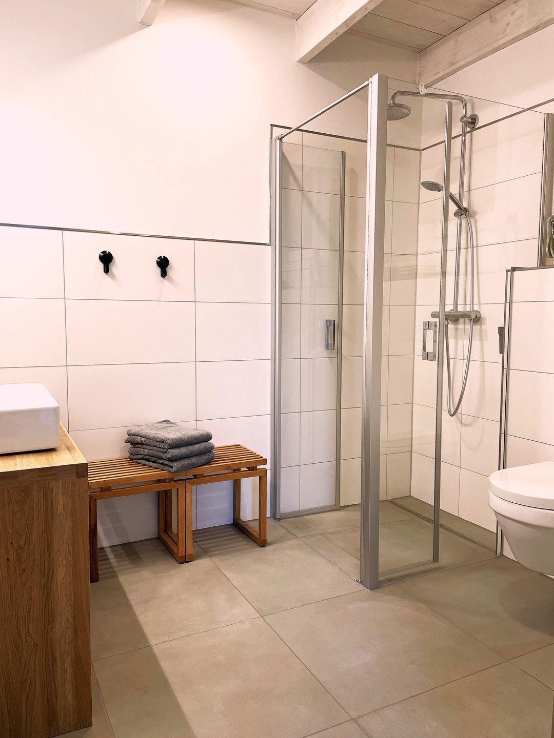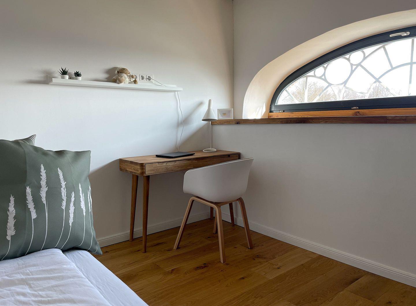 Das Obergeschoss verfügt über zwei geschmackvoll eingerichtete Schlafzimmer, 1x mit Doppelbett (200x180cm), 1x wahlweise mit Einzel-(200x80cm) oder Doppelbett (200x160cm). Das nach Osten ausgerichtete Schlafzimmer verfügt zudem über einen separaten Schreibtisch als Arbeitsplatz. Auch der hier vorhandene Ausblick aus dem historischen runden Fenster oberhalb des alten Scheuneneingangs gibt der Wohnung eine ganz besondere, individuelle Note. Ebenfalls im Obergeschoss befindet sich ein weiteres modernes und geräumiges Bad, ausgestattet mit bodentiefer Regendusche, WC und einer Handtuchheizung.