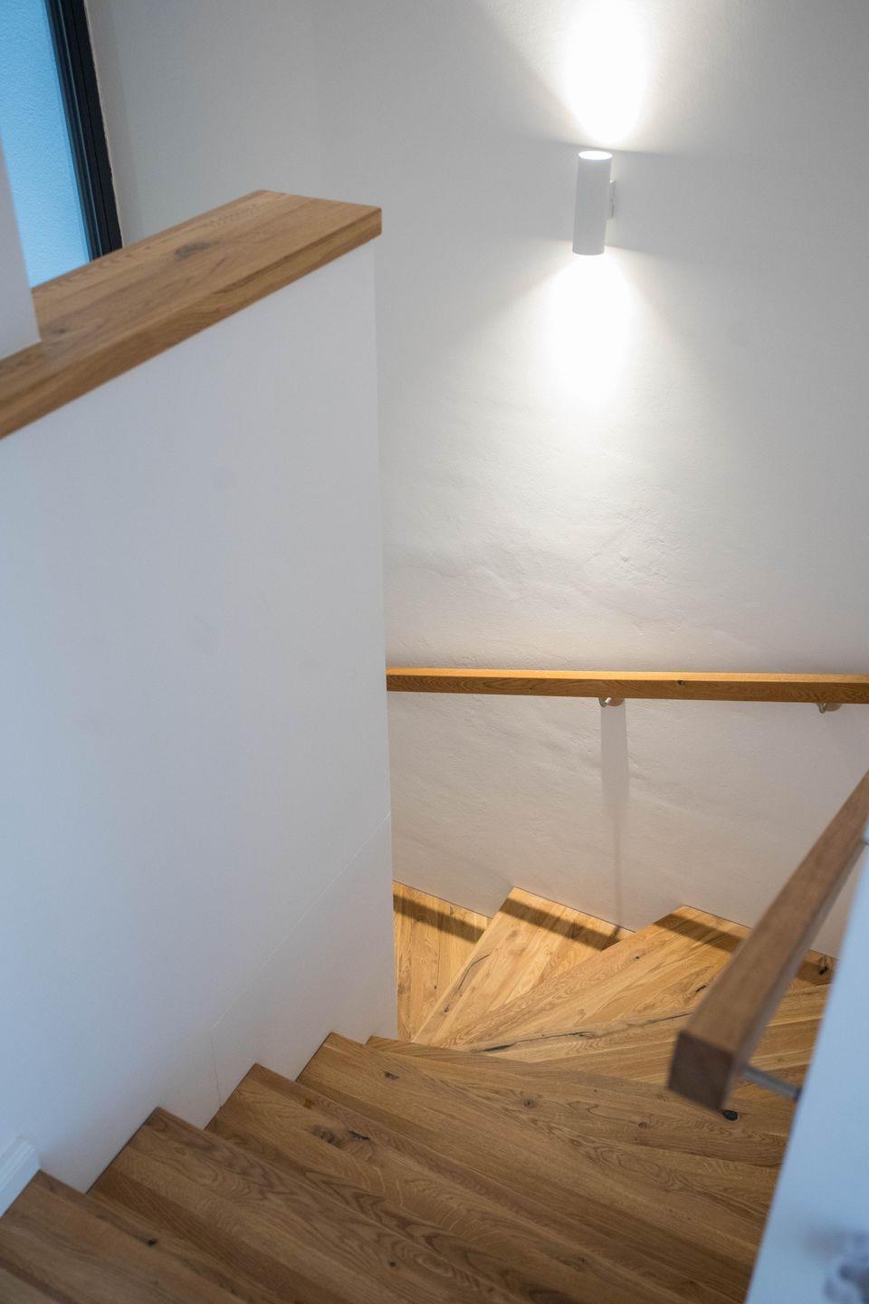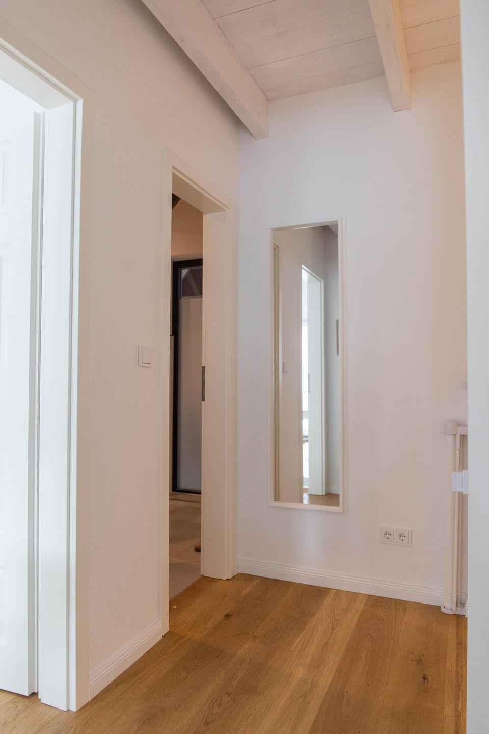 Das moderne Bad im Obergeschoss verfügt über eine bodenebene Dusche, Handtuchheizung und hochwertige Armaturen. Im Erdgeschoss gibt es ein Gäste WC.