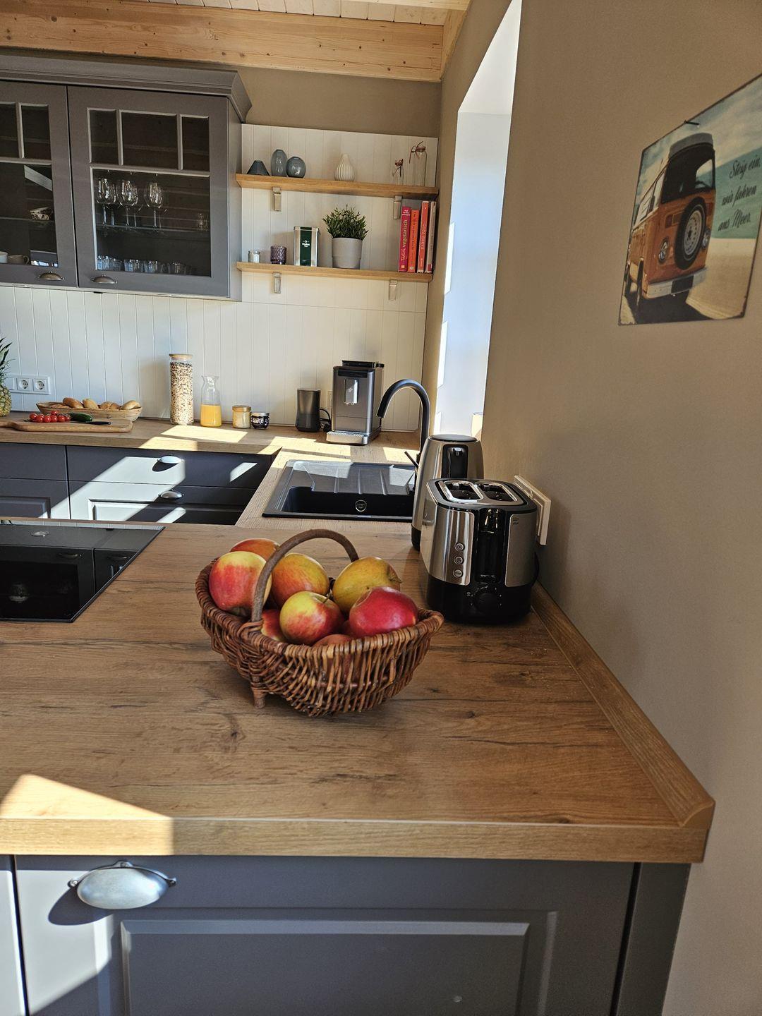 Das großzügige Zuhause erstreckt sich über zwei Etagen und ist mit allem ausgestattet, was Sie für einen komfortablen Aufenthalt benötigen. Die helle und offene Küche, die nahtlos in den Wohnbereich übergeht, ist modern gestaltet und verfügt über alle notwendigen Utensilien, um Ihre Lieblingsgerichte zuzubereiten. Hier finden Sie einen Backofen, ein 4-Platten-Induktionskochfeld, eine Spülmaschine sowie eine Espressomaschine. Der Esstisch bietet genug Platz für gemeinsame Mahlzeiten und gesellige Abende.