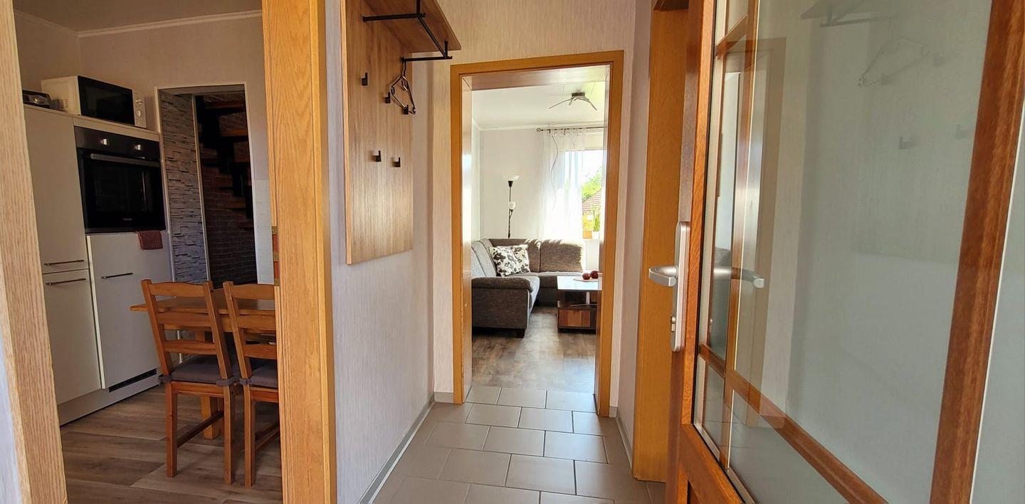 In der voll ausgestattete Küche finden Sie alles, was Sie für die Zubereitung köstlicher Mahlzeiten benötigen. U. a. sind Mikrowelle, Spülmaschine und ein Kühlschrank mit Gefrierfach vorhanden. Genießen Sie Ihre kulinarischen Kreationen am Esstisch. Das helle und freundliche Wohnzimmer ist ideal, um nach einem Tag voller Aktivitäten zur Ruhe zu kommen und sich z. B. bei einem Gläschen Wein zu entspannen. Das Badezimmer, welches modern ausgestattet ist und über eine Dusche, ein WC und einen Föhn verfügt komplettiert das Erdgeschoss. WLAN ist verfügbar. Ein Parkplatz befindet sich vor dem Haus.