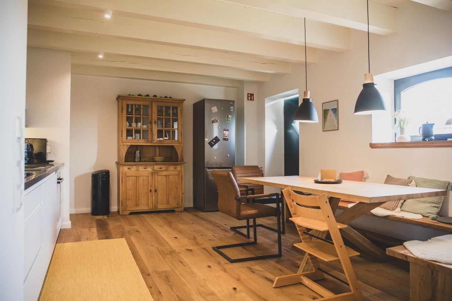 Im Mittelpunkt der Wohnung steht der große Esstisch mit Platz für bis zu 8 Personen – ideal für gemeinsame Mahlzeiten, Spieleabende oder einfach zum gemütlichen Beisammensein. Direkt daneben schließt sich die modern ausgestattete Küche an. Ein freistehender Kühlschrank bietetbesonders viel Stauraum. Dazu sorgen Induktionskochfeld, Geschirrspüler, Kaffee-Vollautomat, Filterkaffeemaschine, Milchaufschäumer, Toaster, Heißluftfritteuse und vieles mehr für höchsten Komfort beim Kochen.