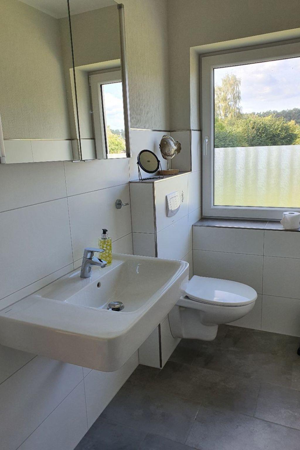 Die Ferienwohnung im ersten Obergeschoss hat eine Wohnfläche ca. 45 qm und ist für die Unterbringung von zwei Erwachsenen und einem Kleinkind hervorragend geeignet. Sie erwartet ein kombinierter Wohn- und Küchenbereich mit einer gemütlichen Couchecke. Im Schlafzimmer befindet sich ein 1,80 m breites Boxspringbett (durchgehende Matratze). Ein gut geschnittenes Badezimmer mit Dusche und WC sowie Tageslicht gehört auch zur Wohnung.