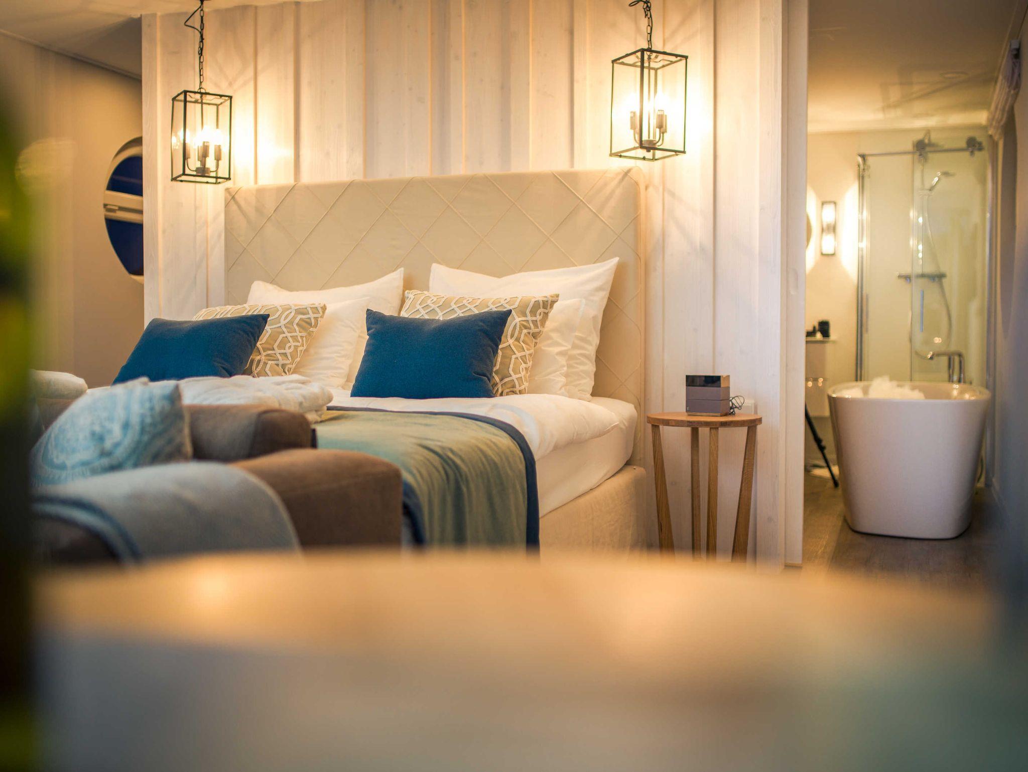 Die Schwimmenden Suiten bieten Freiraum und Rückzugsmöglichkeit. Auf ca. 45 m² erleben Sie ein besonderes stilvolles Wohnerlebnis. Mit hochwertigem Interieur und Freistil-Möbeln von Rolf Benz. Boxspringbetten der Luxusklasse und die gesunde Luft Usedoms versprechen einen langen und erholsamen Schlaf.