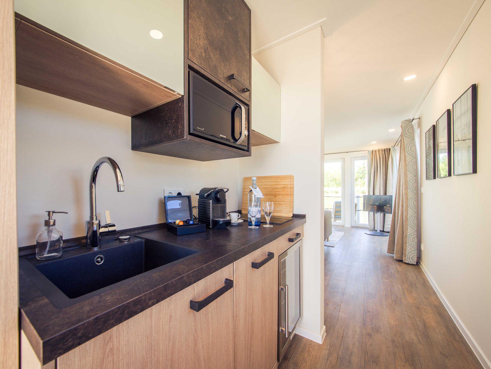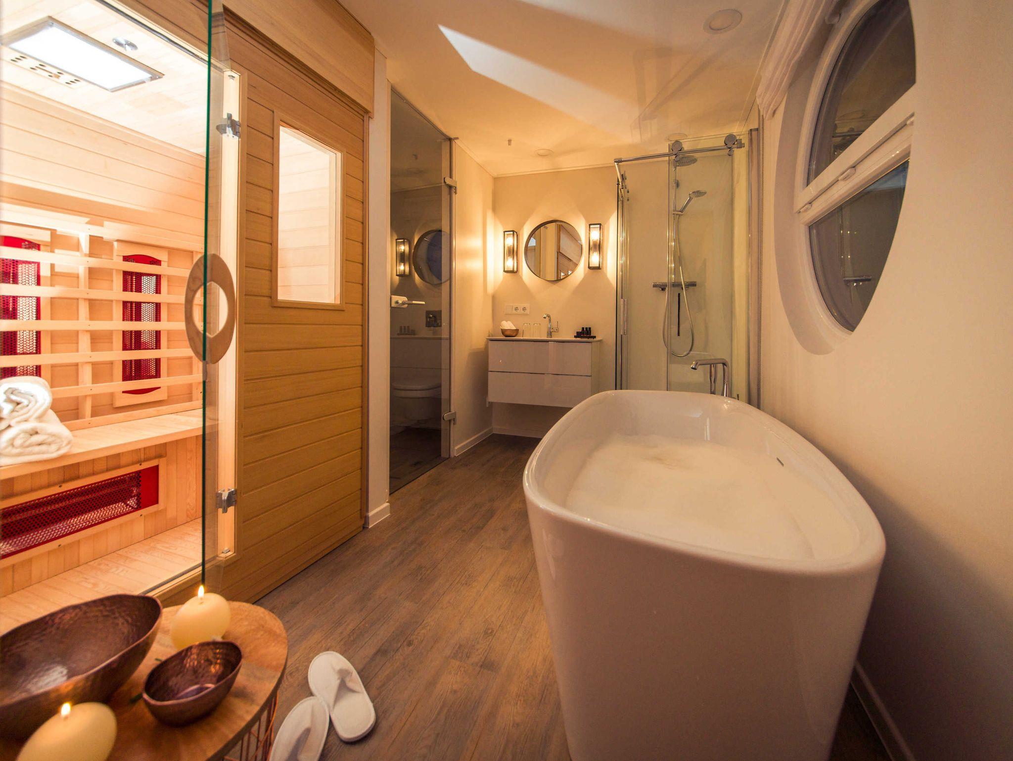 Tauchen Sie in die Welt der Entspannung und des Wohlbefindens. die freistehende Badewanne bietet einen wundervollen Blick auf das Wasser und den Schilfgürtel. In der eigenen Infrarot-Sauna durchströmt behagliche Wärme Ihre Körper. Abkühlung bietet die Terrasse im Außenbereich.