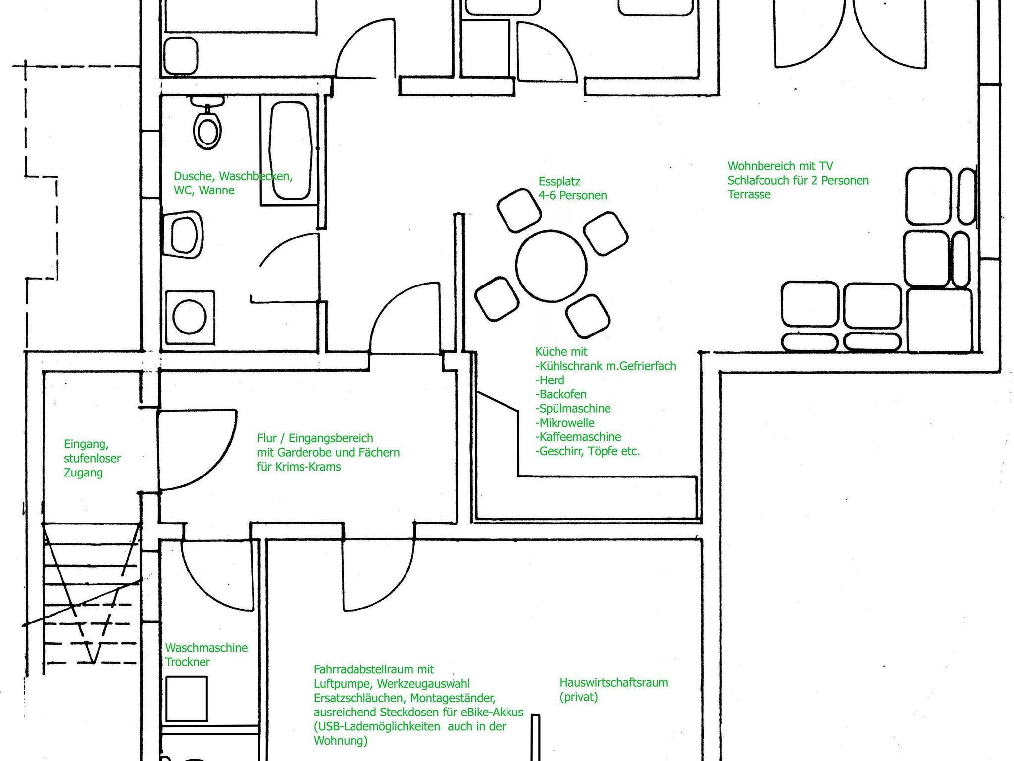 Wir bieten Ihnen eine neu eingerichtete Ferienwohnung. Zwei Doppelzimmer, Wohnküche, Bad und zusätzliches Duschbad und eine Terrasse laden zum erholen ein. Da wir selbst gerne Rad fahren, haben wir unser Angebot beonders für Tourenradler, E-Biker und MTBler ausgerichtet mit eigenem Fahrradraum. Dieser bietet eine sichere Abstellmöglichkeit für die Räder, Lademöglichkeiten für Akkus und Radzubehör, Luftpumpe, Montageständer, etwas Werkzeug, gängige Ersatzschläuche und Kettenöl sind vorhanden. Gemäß den Kriterien von bett+bike.