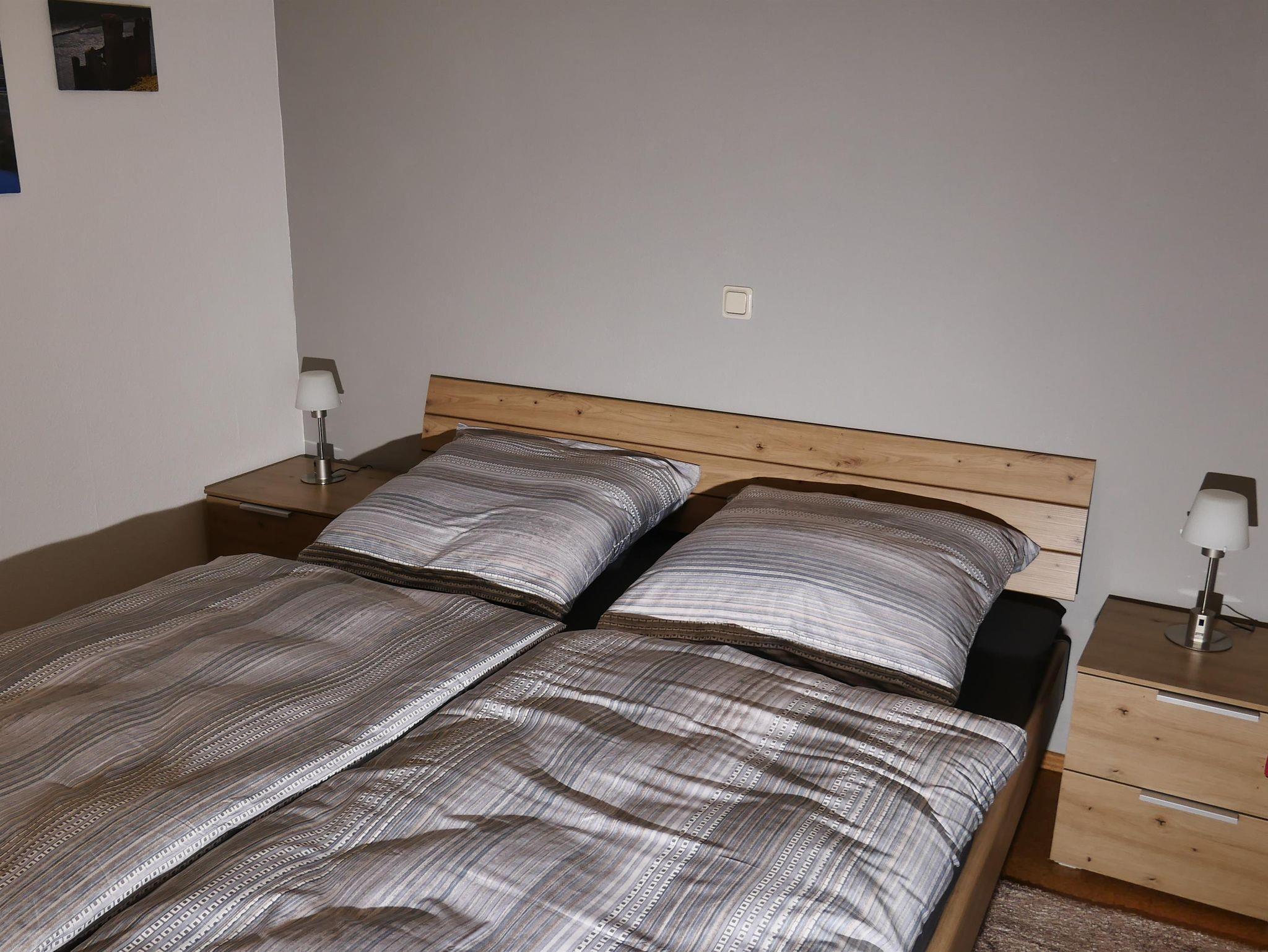 Natürlich sind auch Wanderer, Weingenießer oder Urlauber oder Dienstreisende und Monteure willkommen. Das größere der beiden Schlafzimmer hat ein Doppelbett mit 2,10 m Länge, einen großen Kleiderschrank, Nachttischleuchten mit USB-Lademöglichkeit, das kleinere hat 2 Einzelbetten und einen kleineren Kleiderschrank, ebenfalls Nachttischleuchten mit USB-Lademöglichkeit.
