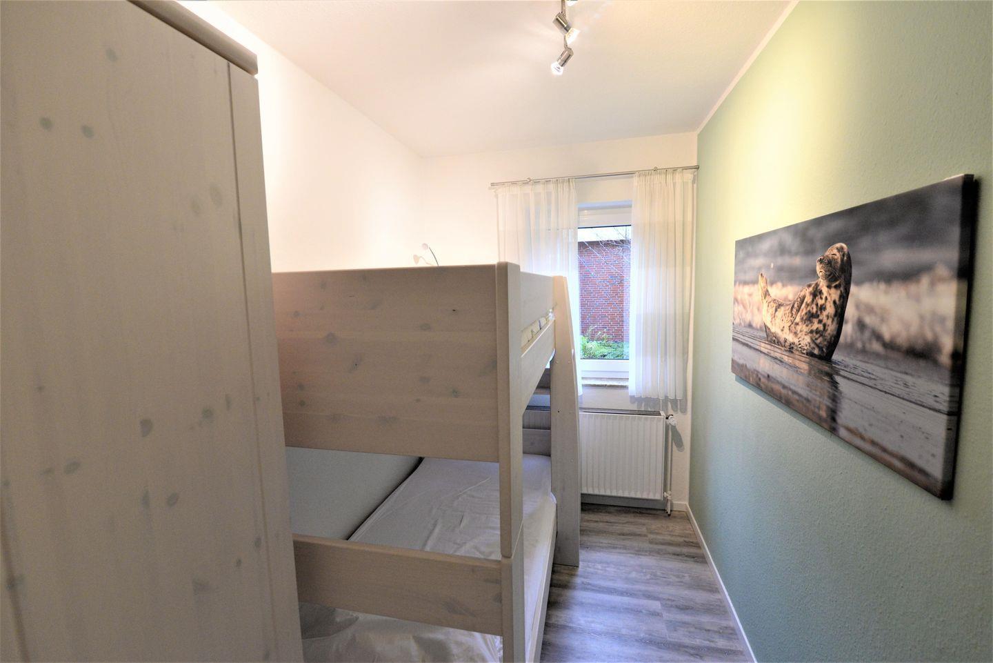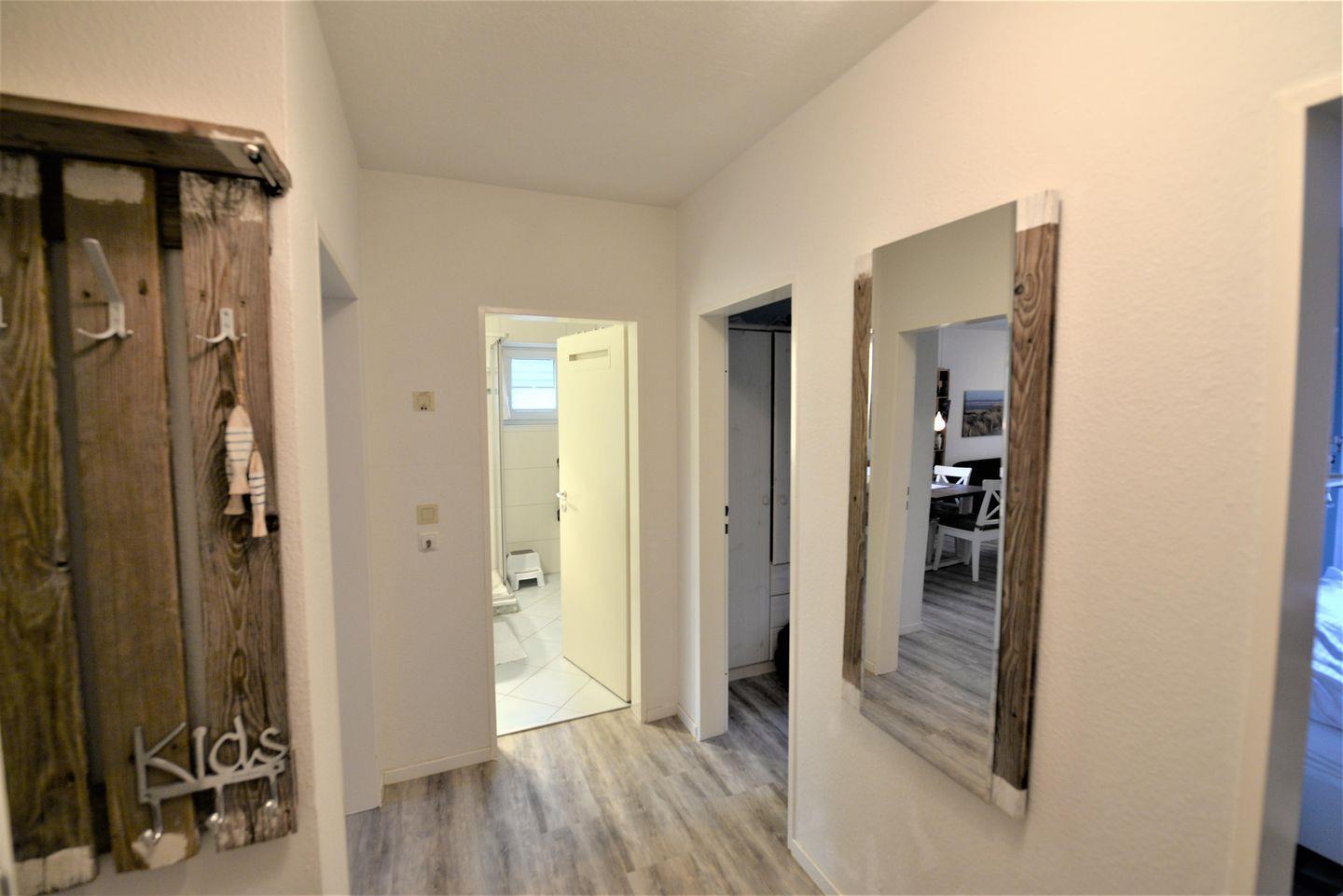 Die Ferienwohnung hat zwei Schlafzimmern mit Doppel- und Etagenbett, einem geräumigen Wohn-/ Küchenbereich, einem Badezimmer und einem Südbalkon.