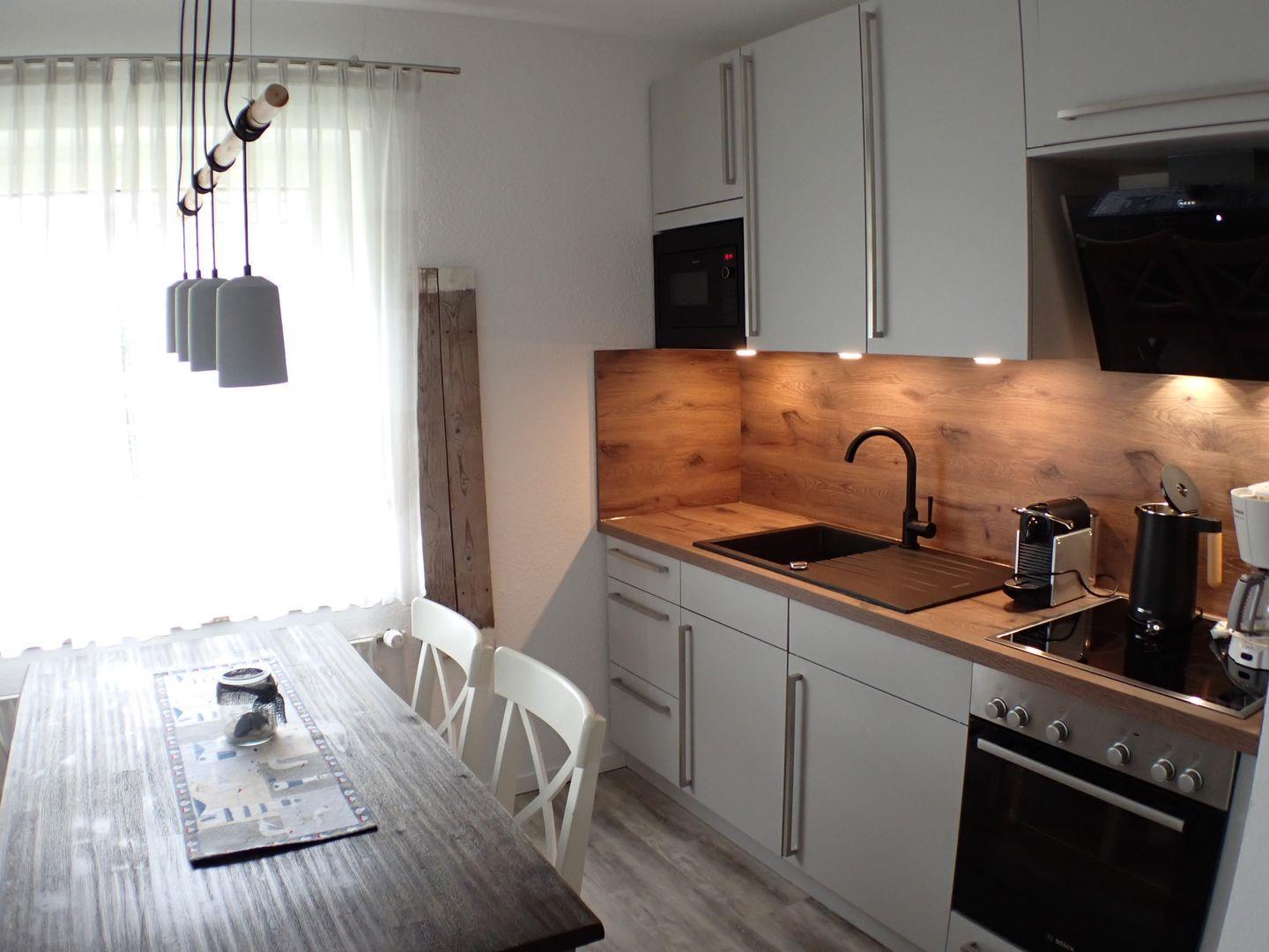 Das Wohnzimmer verfügt über eine Schlafcouch und kann vollständig abgedunkelt werden, sodass insgesamt bis zu sechs Personen in dieser FeWo auf Langeoog übernachten können. In der gut ausgestatteten Küche finden Sie einen vierflammigen Herd mit Ceranfeld und Backofen sowie einen Tischgrill, ein Raclettegerät, eine Mikrowelle, einen Wasserkocher und eine Kaffeemaschine. Die Ausstattung umfasst des Weiteren ein Babybett und einen Hochstuhl für Ihre Kleinsten, kostenloses WLAN und Telefonieren ins deutsche Festnetz, einen Flachbildfernseher sowie einen Blu-ray-Player. Urlaubslektüren, Kinderspielzeug und Gesellschaftsspiele ergänzen unser Angebot. Bei Bedarf können Sie die Waschmaschine und den Trockner ( kostenpflichtig ) im Speicher nutzen.
