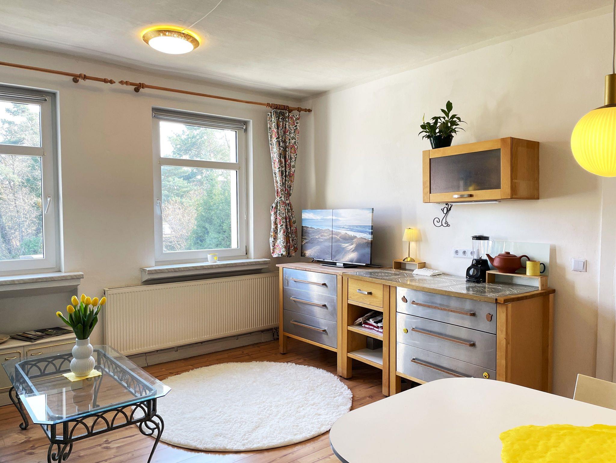 Die gemütliche Ferienwohnung in der oberen Etage der Doppelhaushälfte „Villa Seenswert“ bietet auf ca. 60m² Platz für bis zu 4 Personen. Herzstück der Wohnung ist die helle Wohnküche mit großem Esstisch, TV und moderner Ausstattung wie Geschirrspüler, Mikrowelle, Kaffeemaschine, Espressokocher, Standmixer, Herd mit Backofen und Kühl-Gefrierkombination – ideal für gemeinsame Mahlzeiten und gesellige Abende.