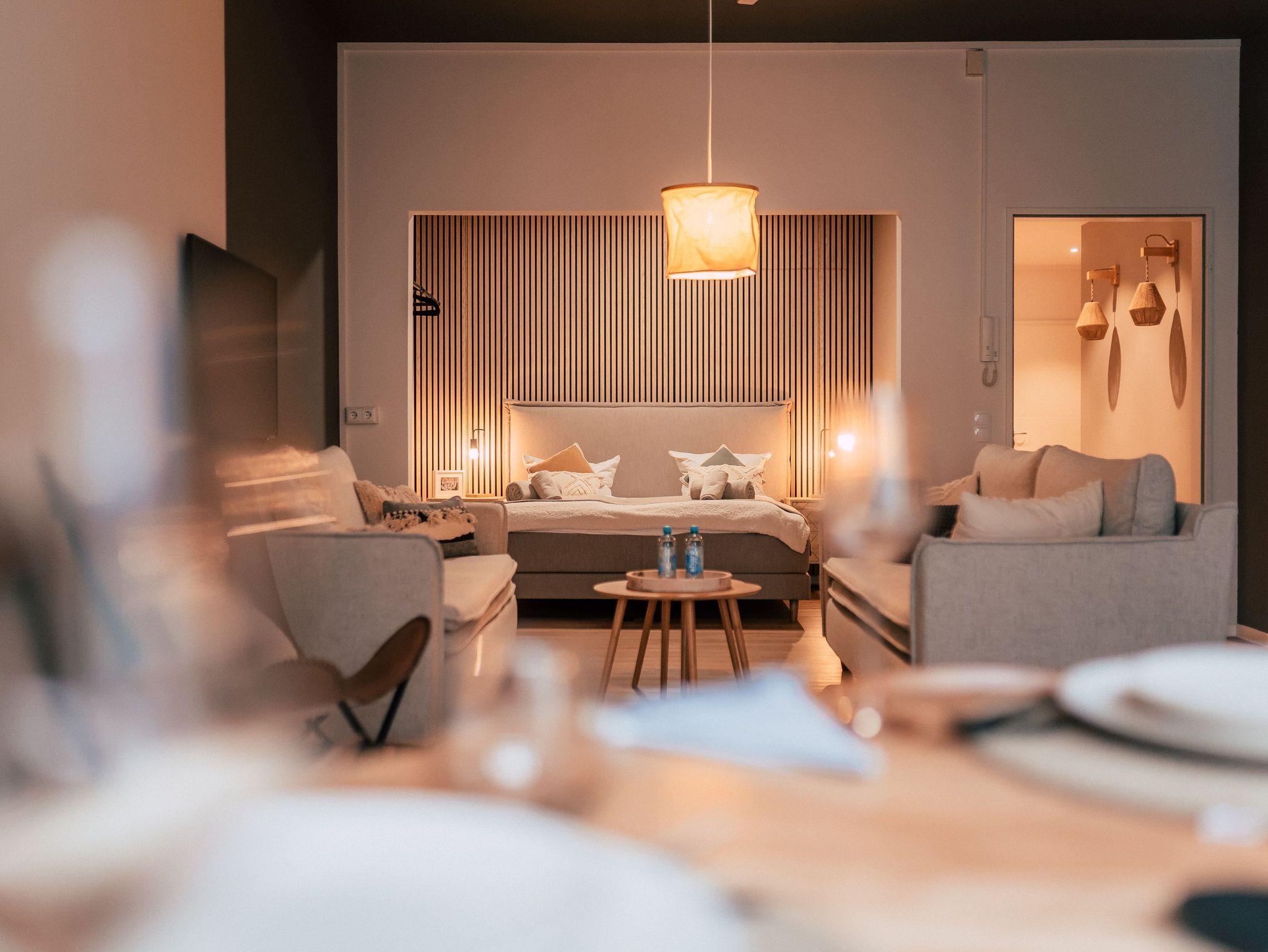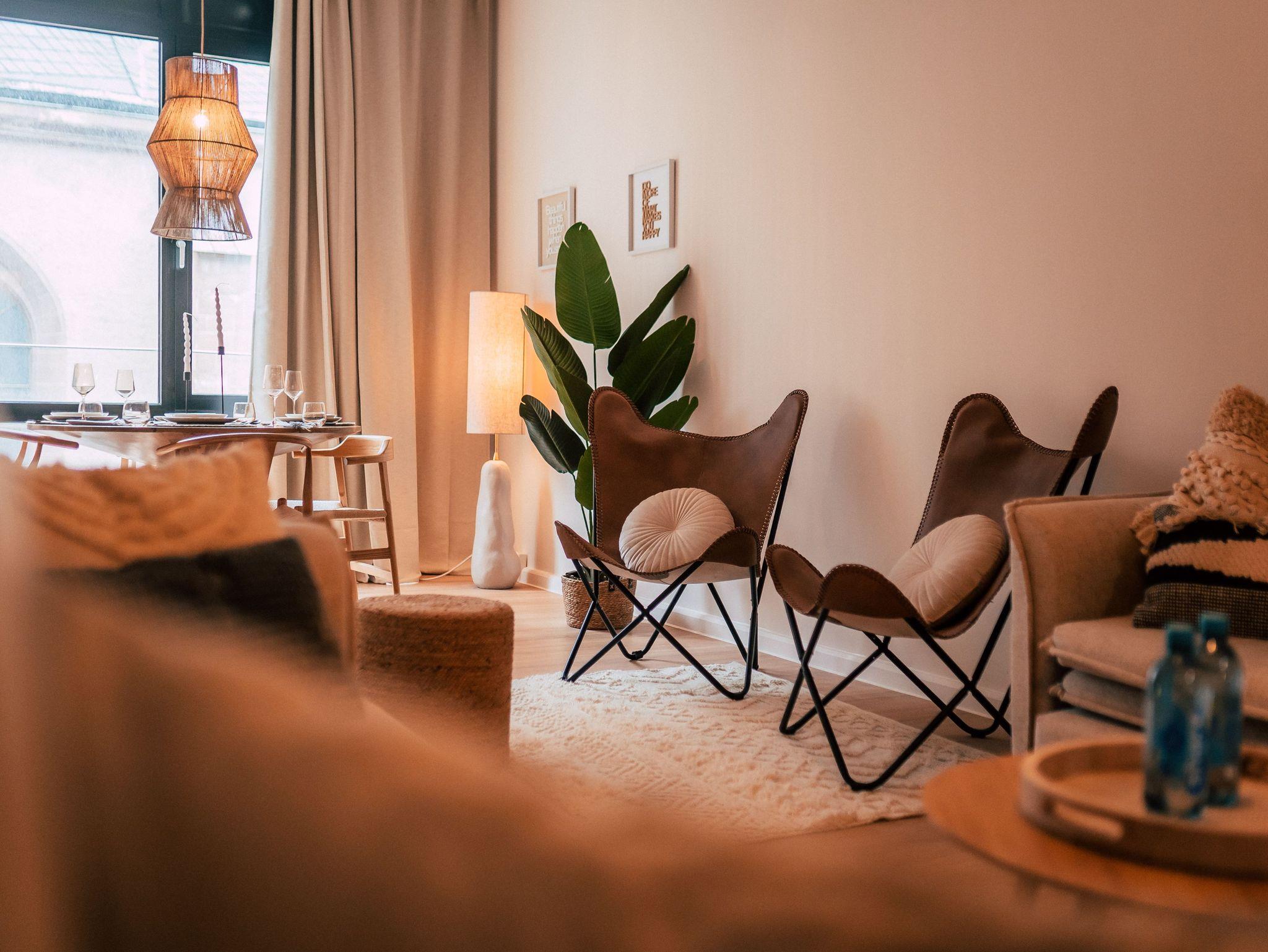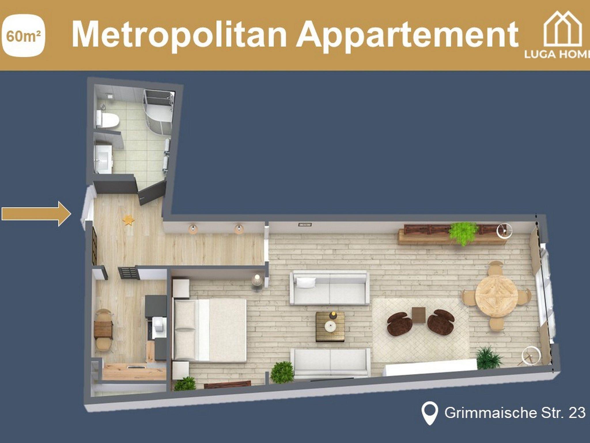 Mit Blick auf die berühmte Nikolaikirche liegt unser *Metropolitan* Apartment inmitten der Altstadt und Einkaufsmeile der Stadt Leipzig. Das moderne Apartment verfügt über ein schickes Badezimmer mit Dusche und eine separate, gut ausgestattete Küche. Das Highlight ist der geräumige Wohn- und Schlafraum, der sich bis zu einer großen Fensterfront zur Kirche hin erstreckt. Leicht abgetrennt und stilvoll in Szene gesetzt, befindet sich der Schlafbereich mit typischem Boxspringbett für den weichen Fall. Hartes Industriedesign trifft auf rustikale Wohnlichkeit und schafft ein geschmackvolles, urbanes Ambiente, das eine liebevolle Hommage an das City Life des aufstrebenden Leipzigs ist.