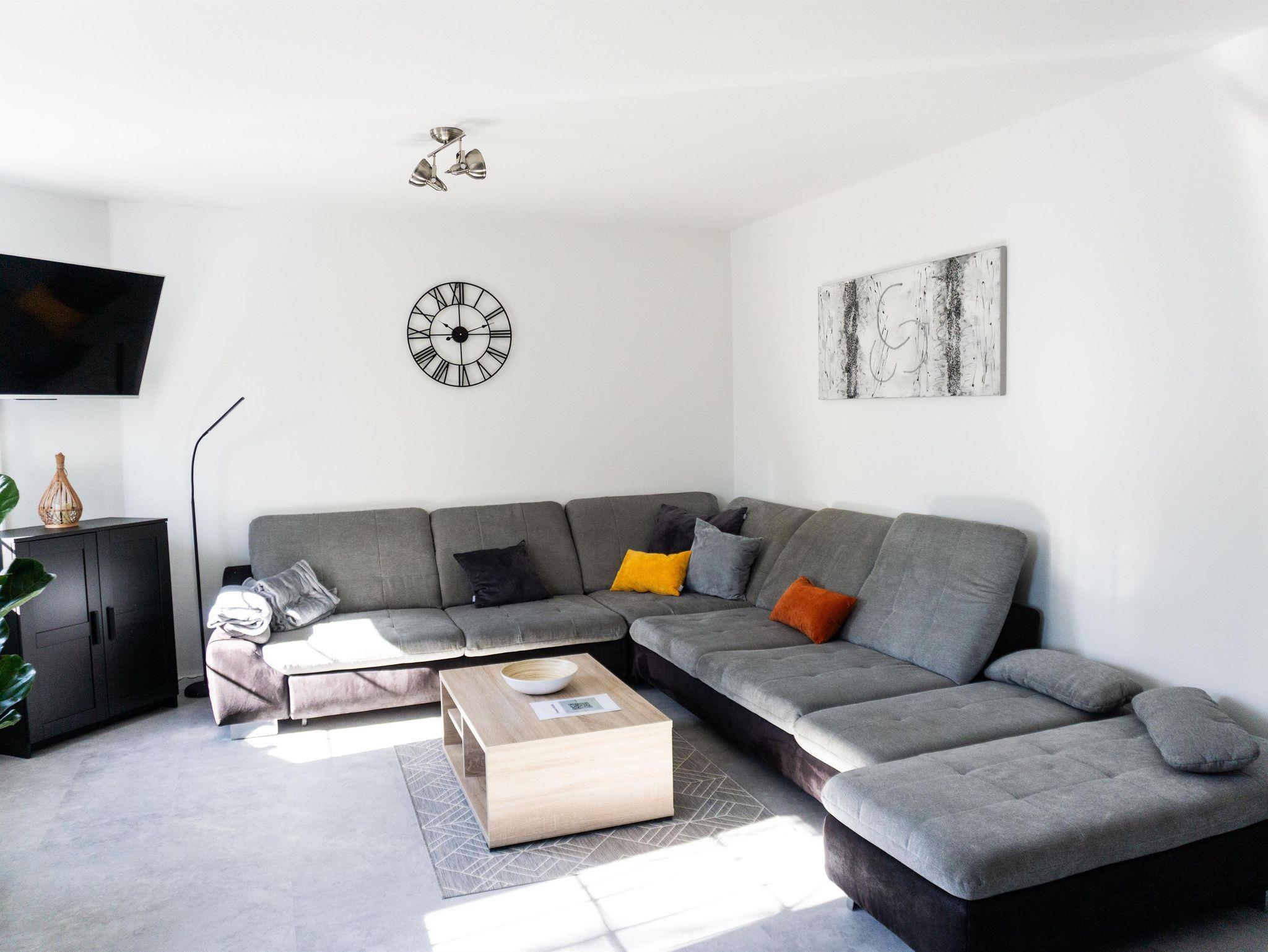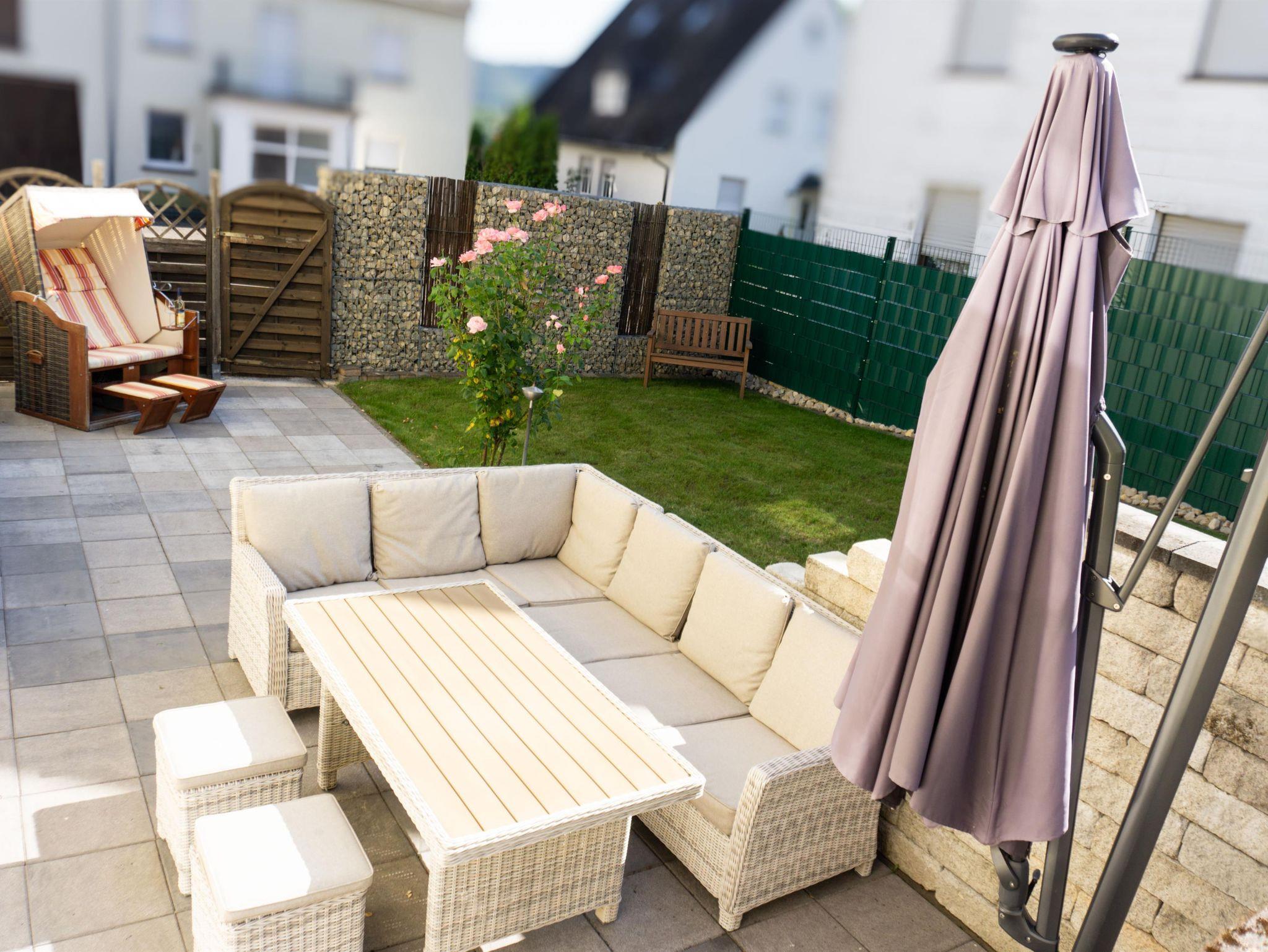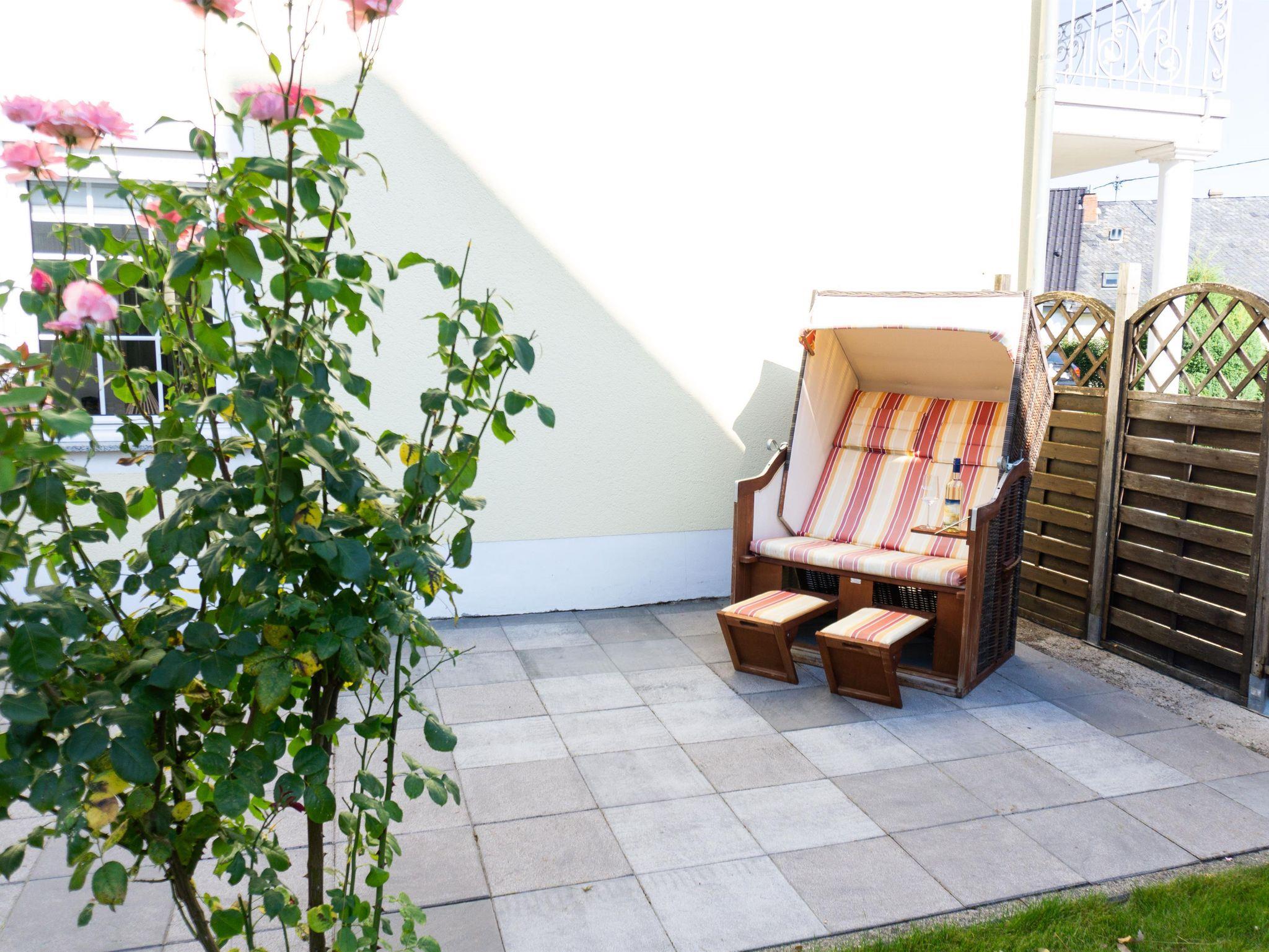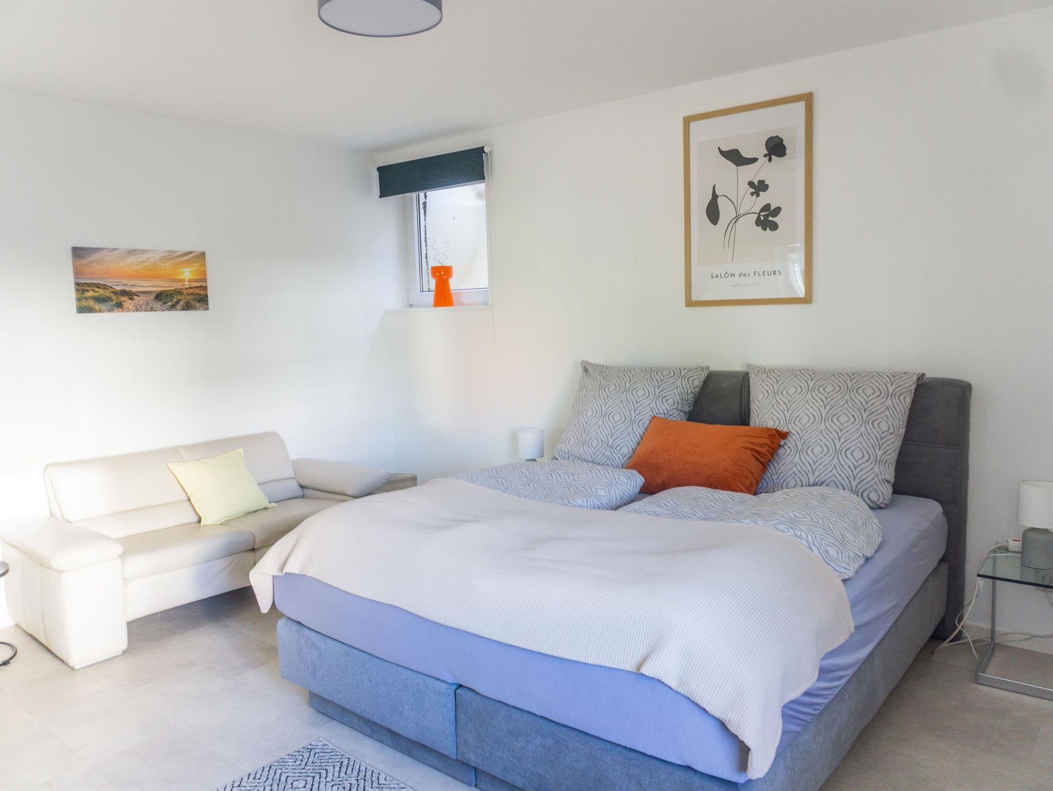 Ferienwohnung (115 m²) mit Küche, Wohnzimmer, 2 Doppelschlafzimmer mit Boxspringbetten (1,80 m x 2,00 m), Bad mit Dusche/WC, große Terrasse mit Sitzgruppe, Strandkorb und Grill.