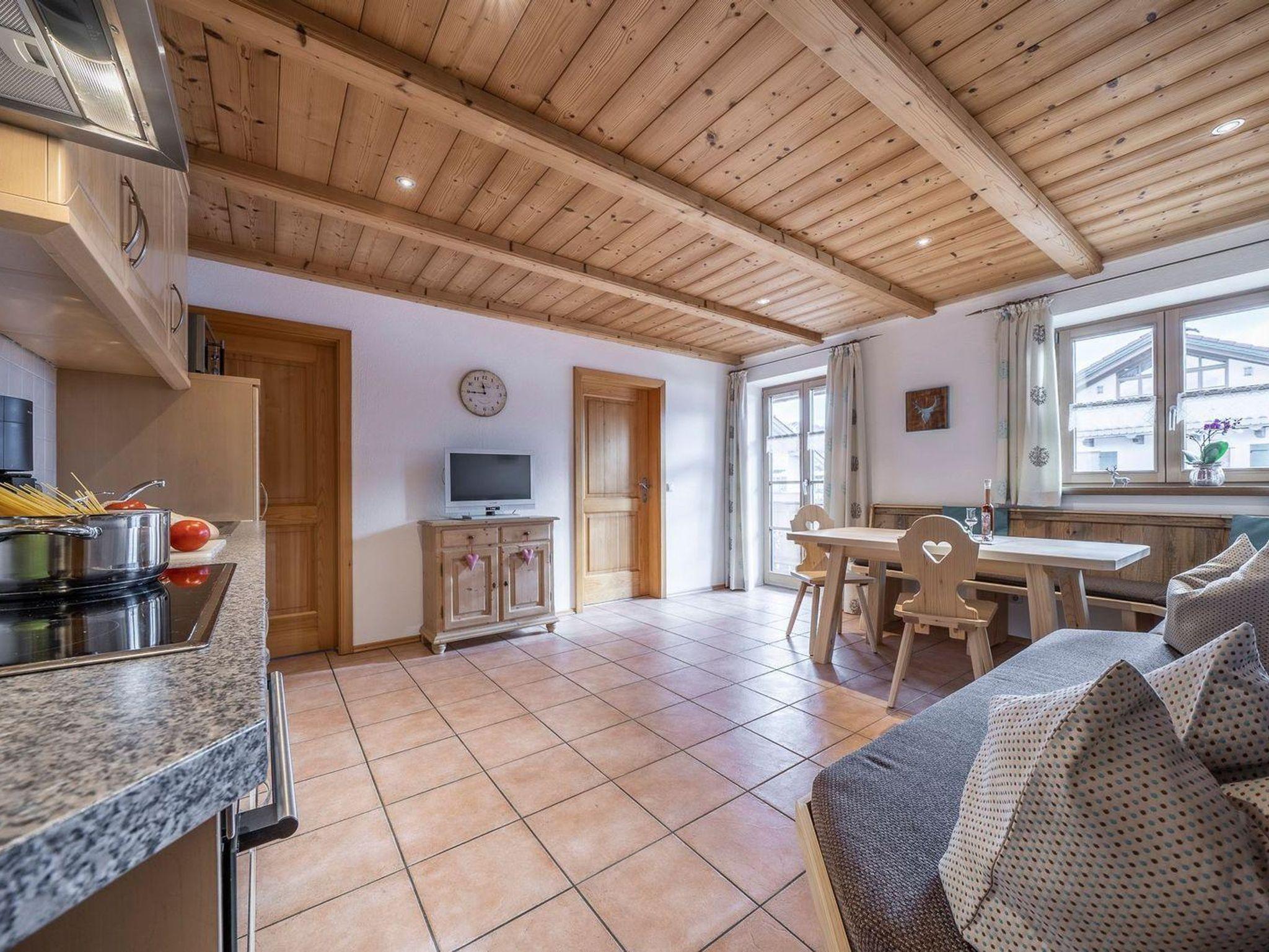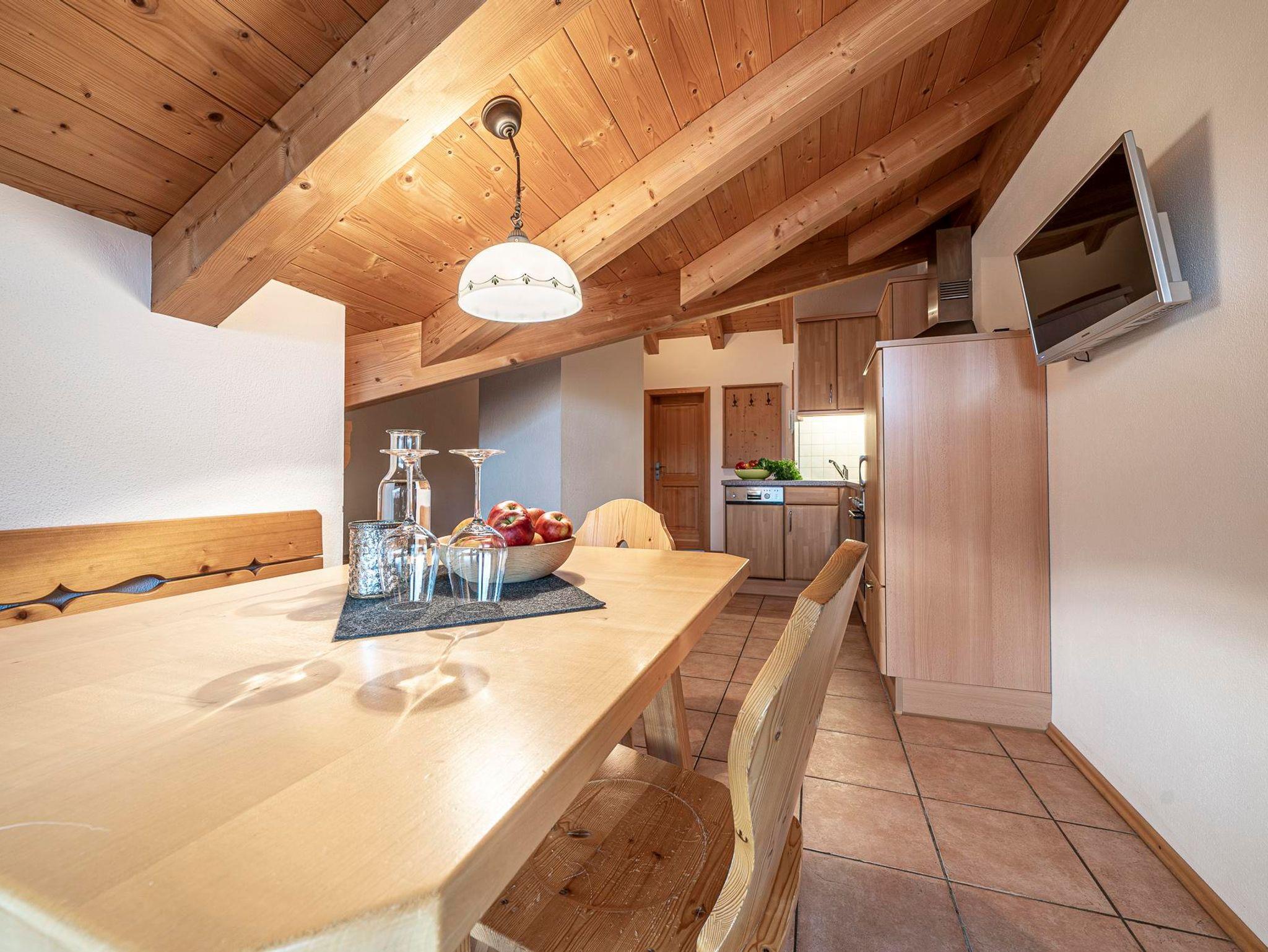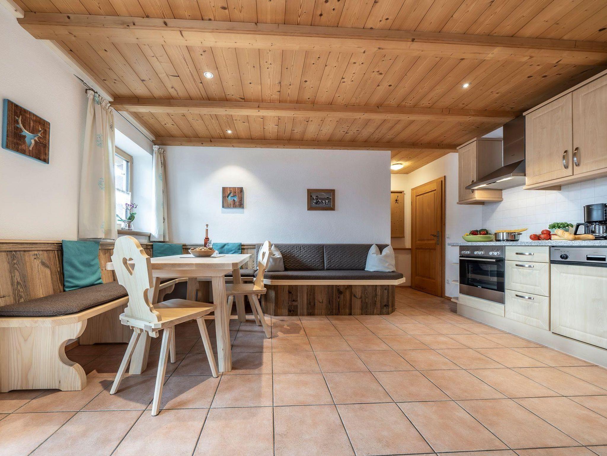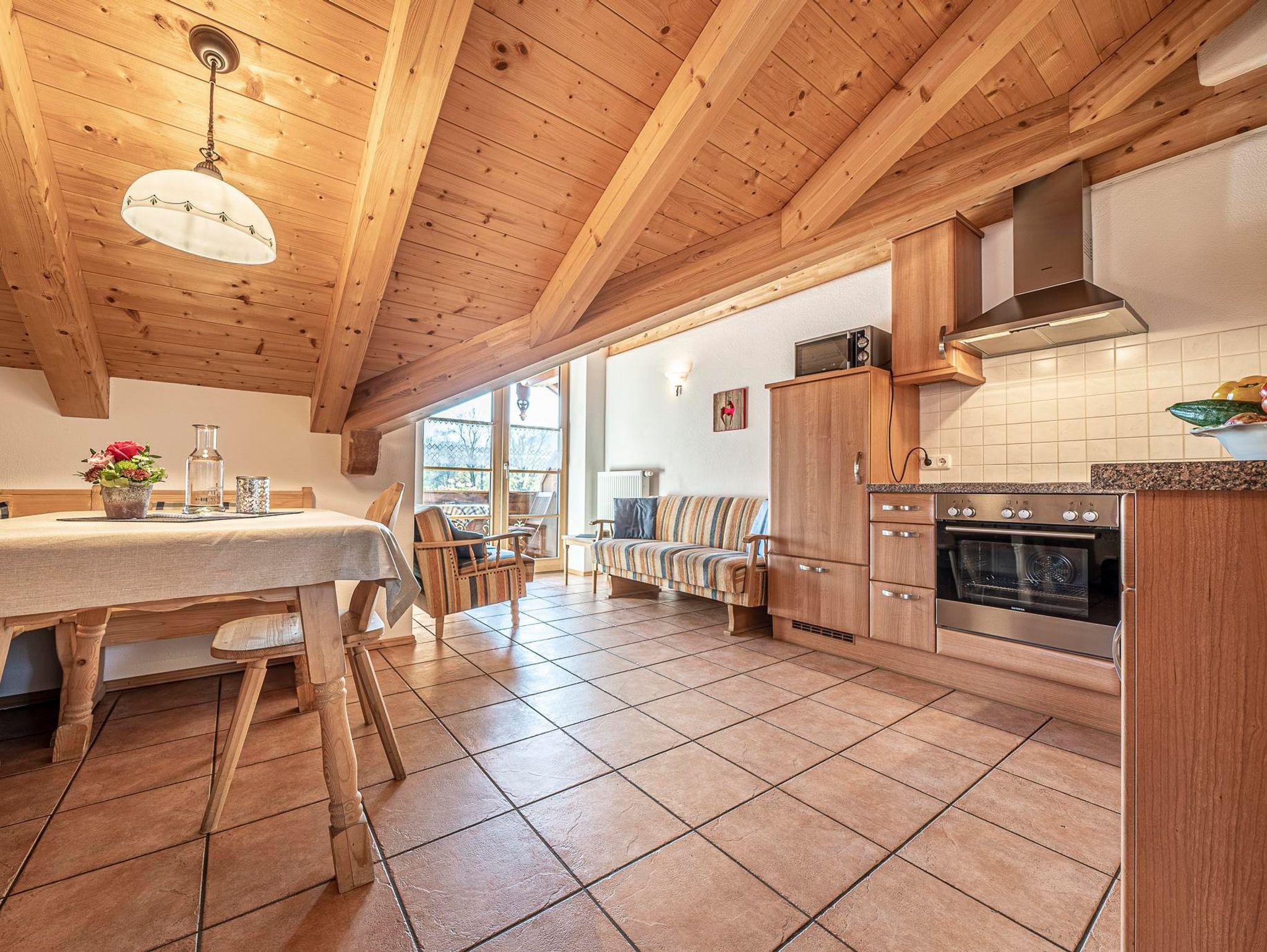 **** Ferienwohnung im 1. Stock, mit zwei handgefertigten Schlafzimmern aus Eichen- und Zirbenholz, einer komplett ausgestatteten Wohnküche mit Spülmaschine, Backofen, Mikrowelle, Kaffeemaschine und Flachbildfernseher. Das Bad ist mit Badewanne und Dusche/WC, Hand- und Badetücher, Handtuchtrockner, Kosmetikartikel und Fön. Großer möblierter Balkon mit unverbauter Bergsicht.