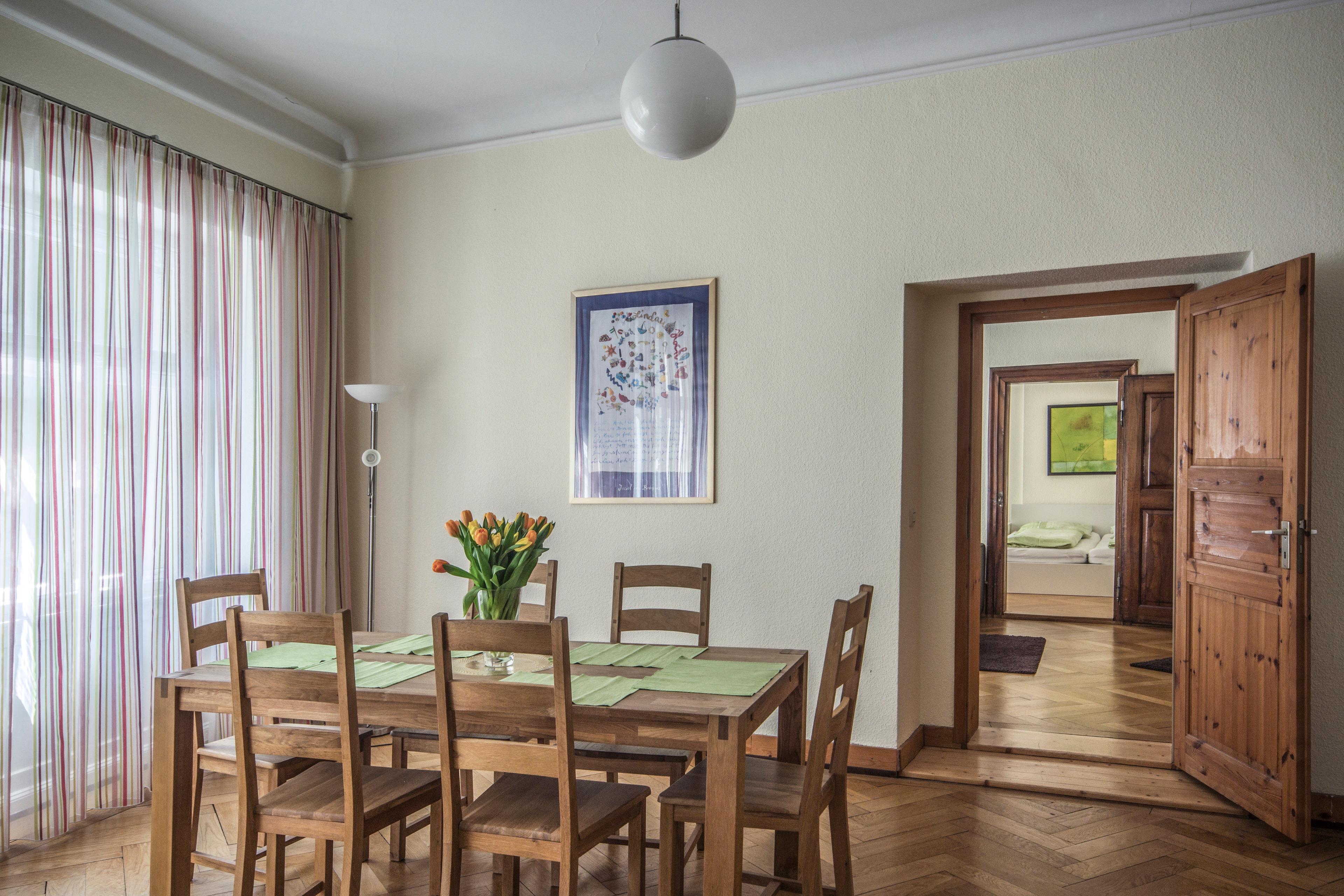 Ein großes, modernes Esszimmer mit offener Küche ist das gemütliche Herzstück dieser Wohnung. Wenn Sie die Geräumigkeit eines Altbaus lieben, werden Sie sich hier wohlfühlen.