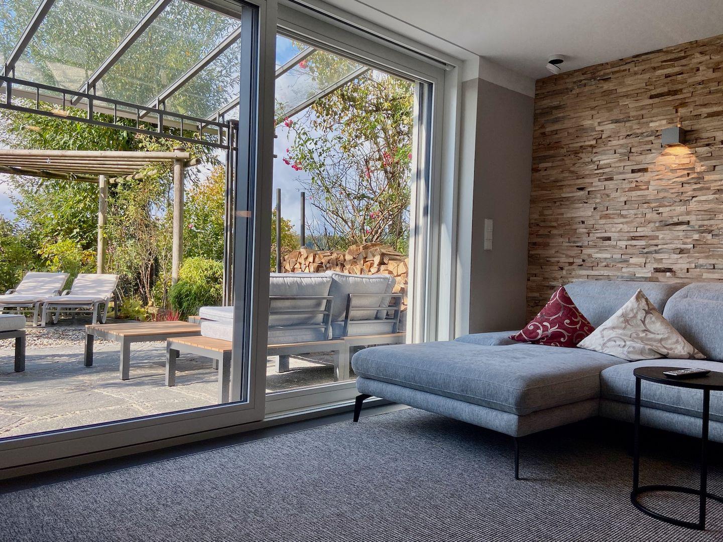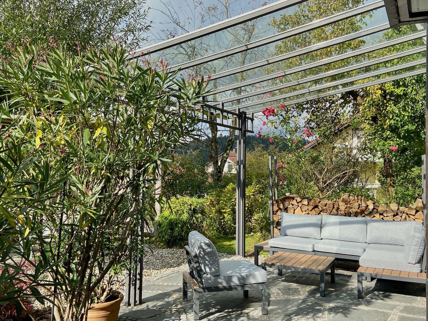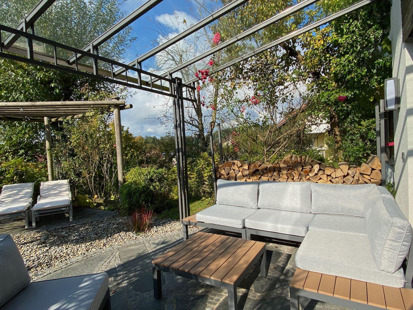 Das lichtdurchflutete Wohnzimmer mit XXL-Schiebetüre schafft den perfekten Übergang zum Gartenparadies und bietet auf der Sonnenterrasse eine sehr großzügige-Pergola mit geschütztem Glasdach. Hier können Sie relaxen und auf der hochwertigen Lounge-Sitzgruppe das idyllische Gartenambiente in absoluter Ruhe genießen.