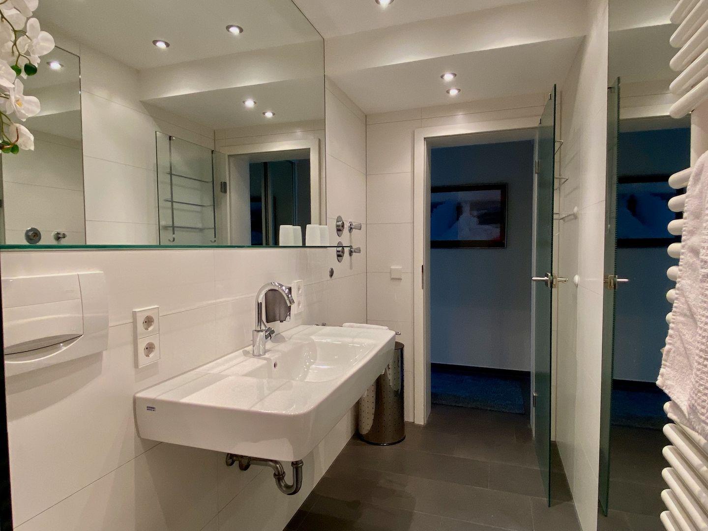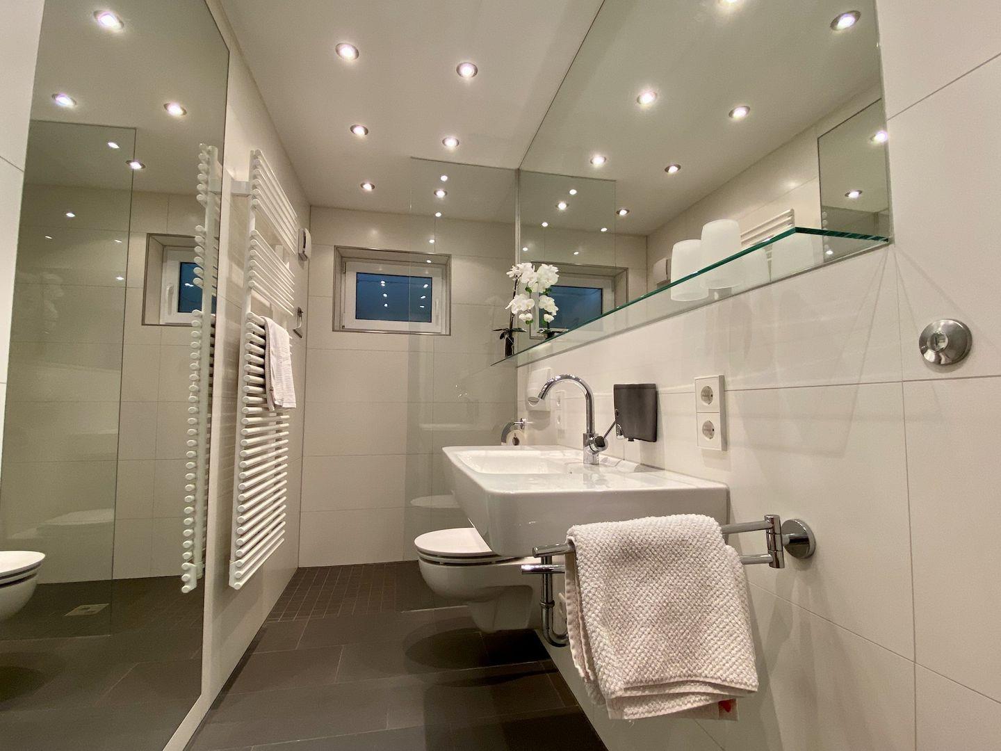 Im Badezimmer - mit WC - erwartet Sie eine bodenebene Dusche mit Glaswand und heizbarem Handtuchhalter.