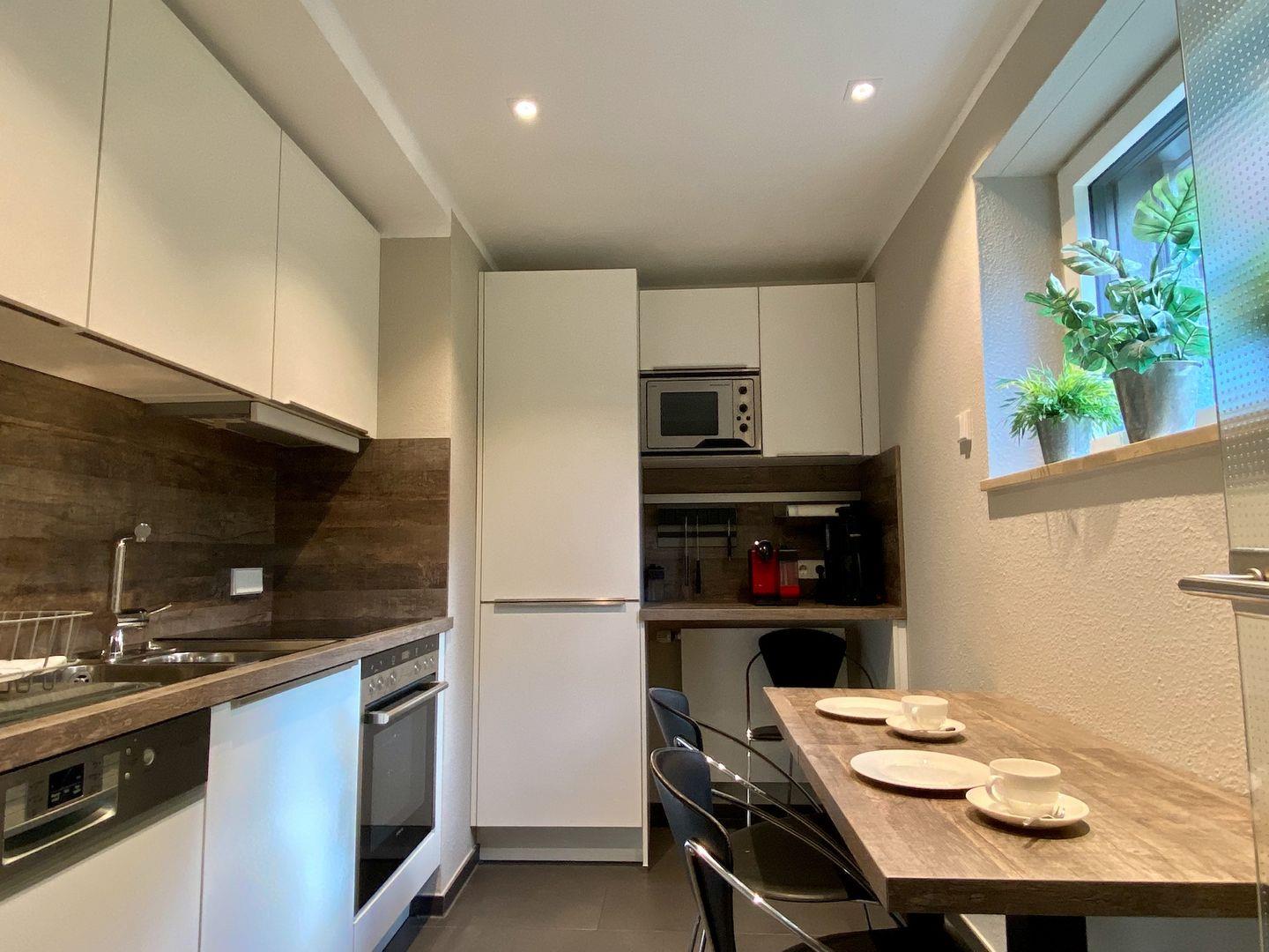 Ein großer Flach-TV an der Wand; elektrische Außenjalousien; dimmbare Lichttechnik, moderne Decken-Einbaustrahler und eine gute WLAN-Verbindung runden die Komfortausstattung dieser außergewöhnlichen Terrassenwohnung ab. Waschmaschine und Trockner kann nach Terminabsprache mit genutzt werden.