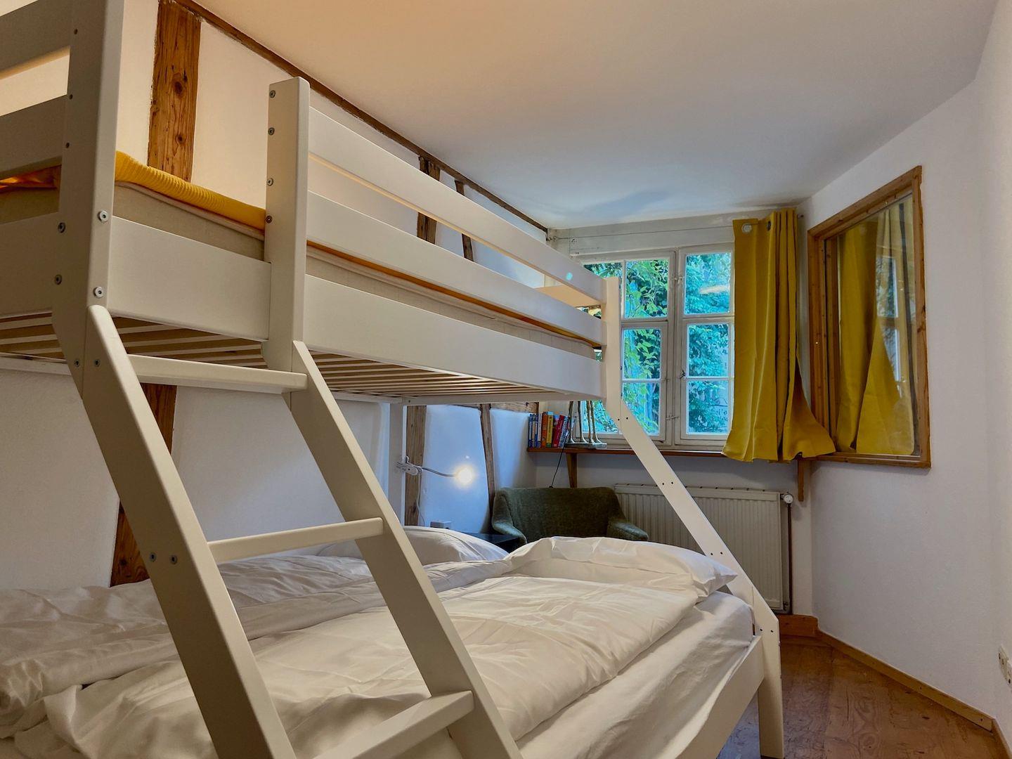 Ein Schlafzimmer ist mit einem Doppelbett (140x200 cm) ausgestattet. Das zweite Schlafzimmer verfügt über ein Etagenbett mit den Maßen 140 x 200 cm (unten)bzw. 90 x 200 cm (oben). Die Wohnung ist für maximal 4 Personen geeignet.