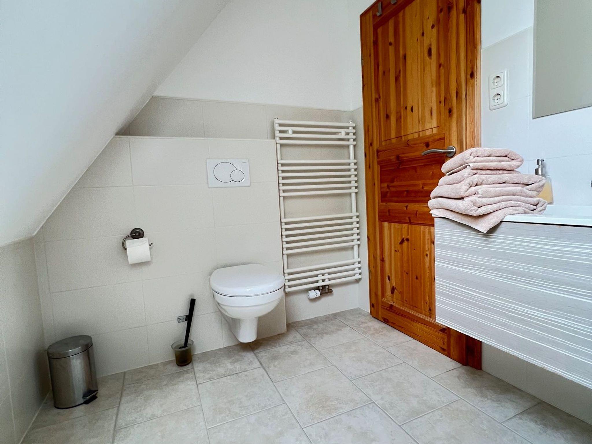 Doppelbett sowie ein Duschbad mit WC. Die Dachschrägen und der Holzdielenboden verleihen der Unterkunft