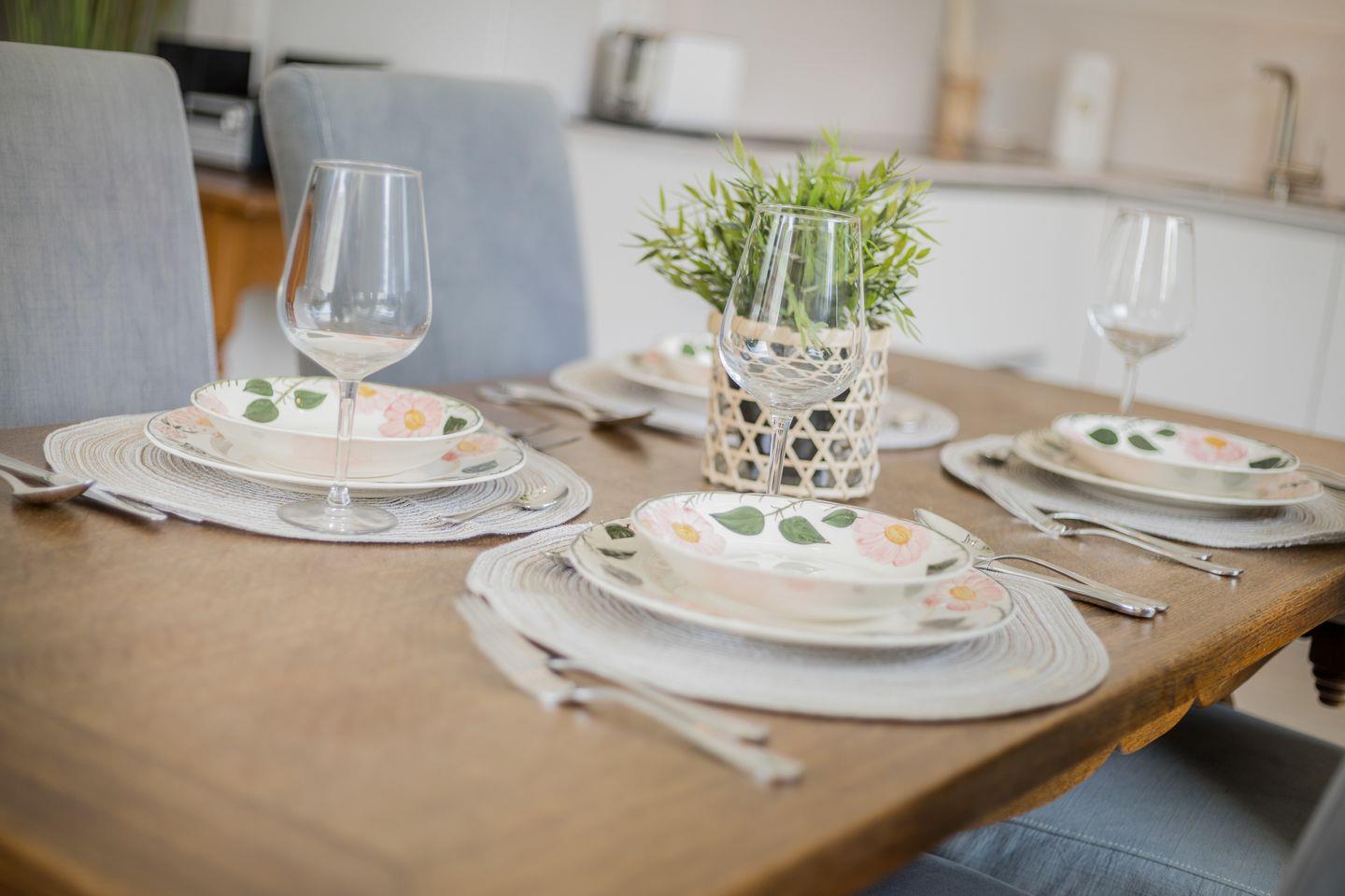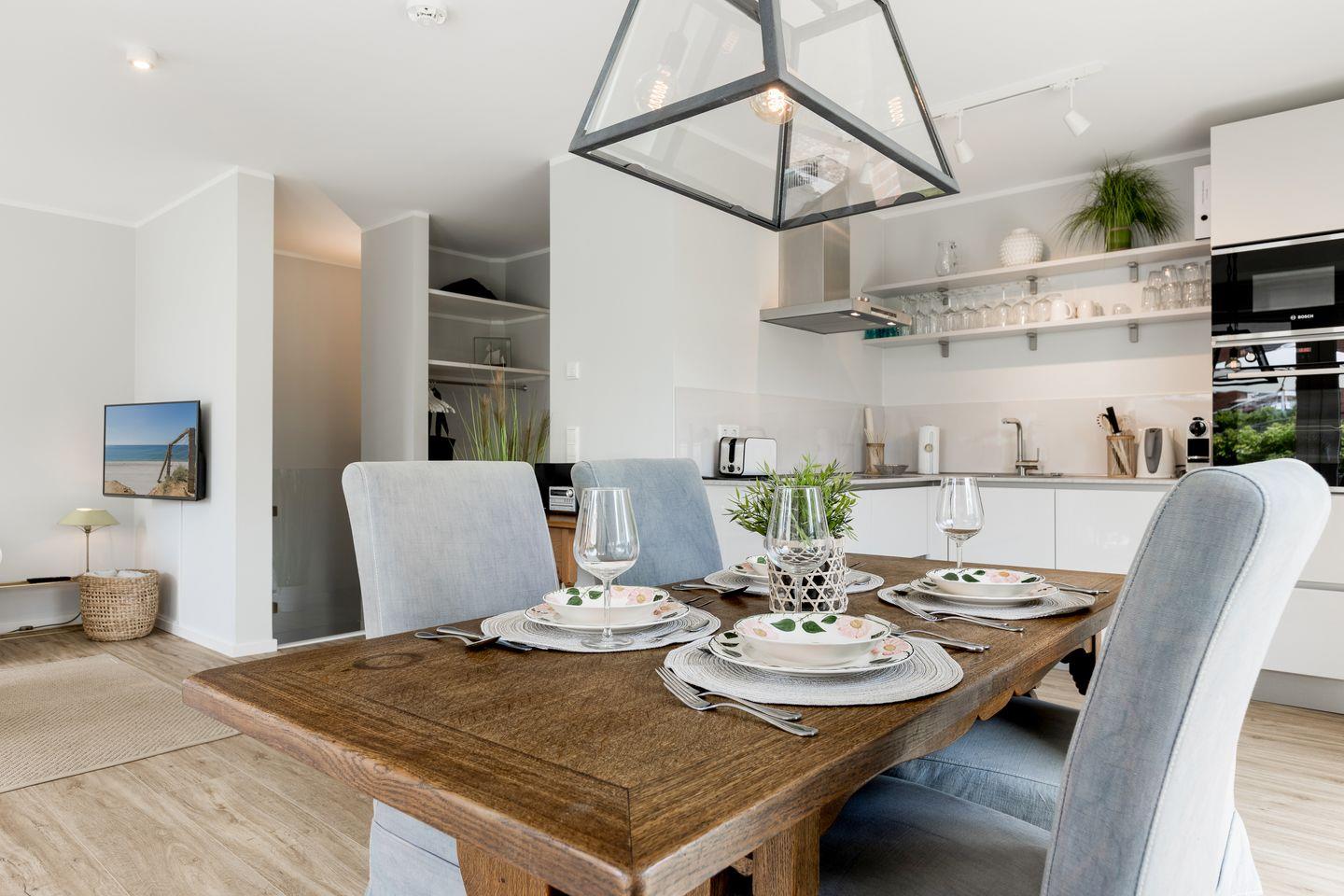Im großzügigen Wohn-, und Essbereich können Sie ausgiebig entspannen oder mit der Familie ein Urlaubsdinner zaubern. Die Küche ist mit allem ausgestattet, was das Urlauberherz begehrt. Von hier aus betreten Sie Ihre möblierte Terrasse, die im Sommer zum Entspannen einlädt.