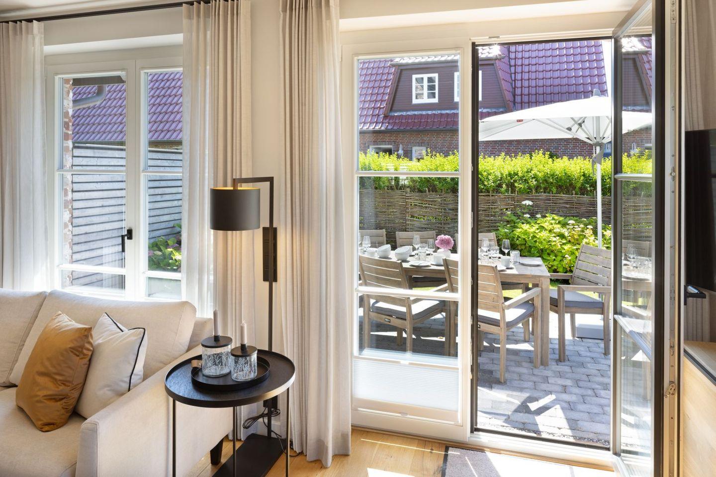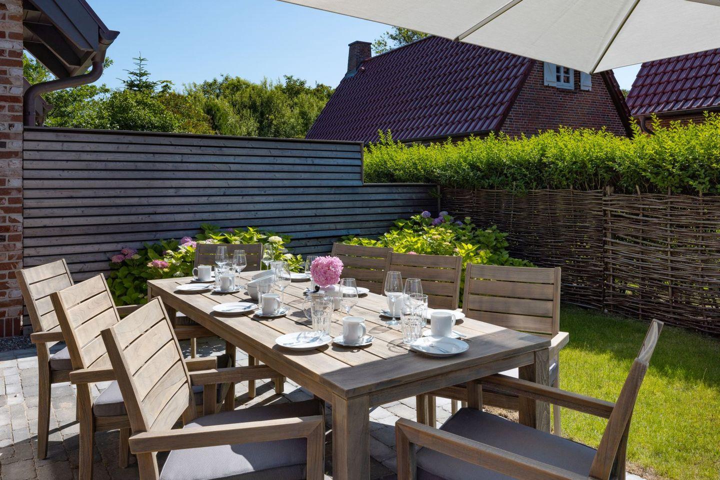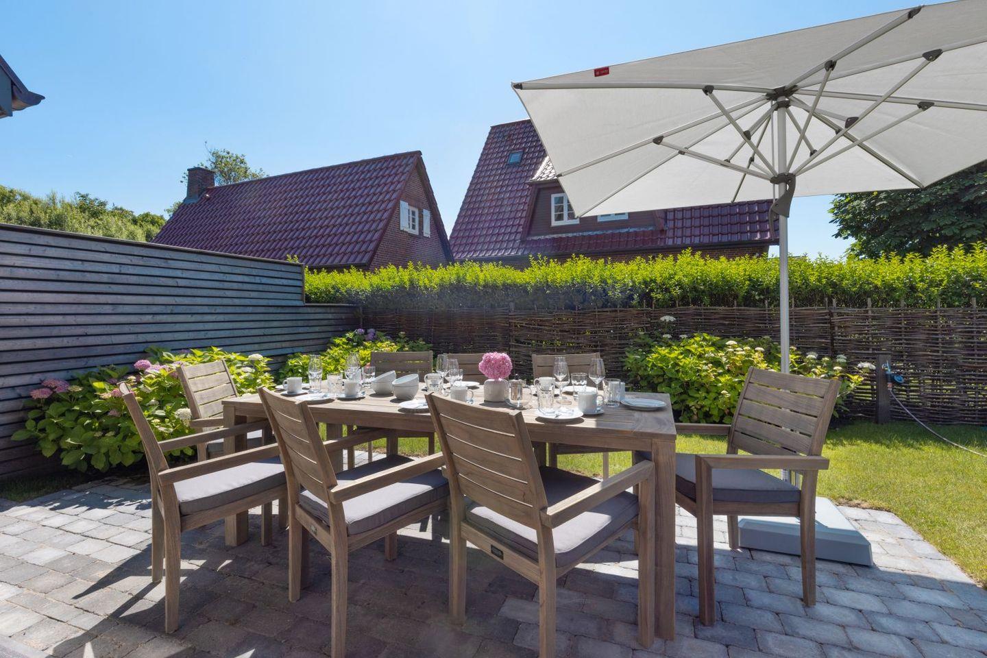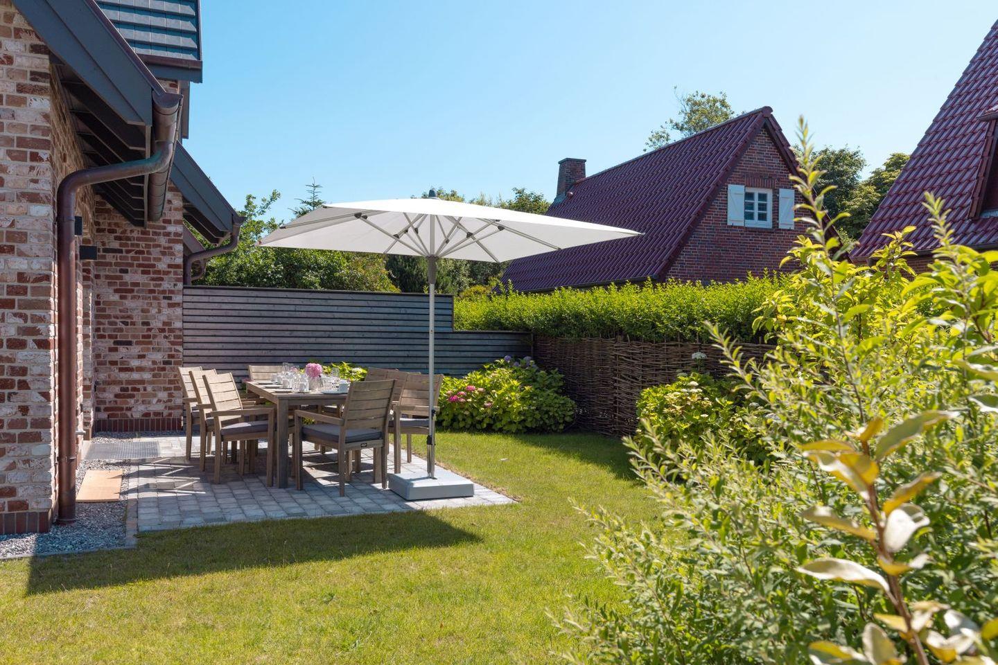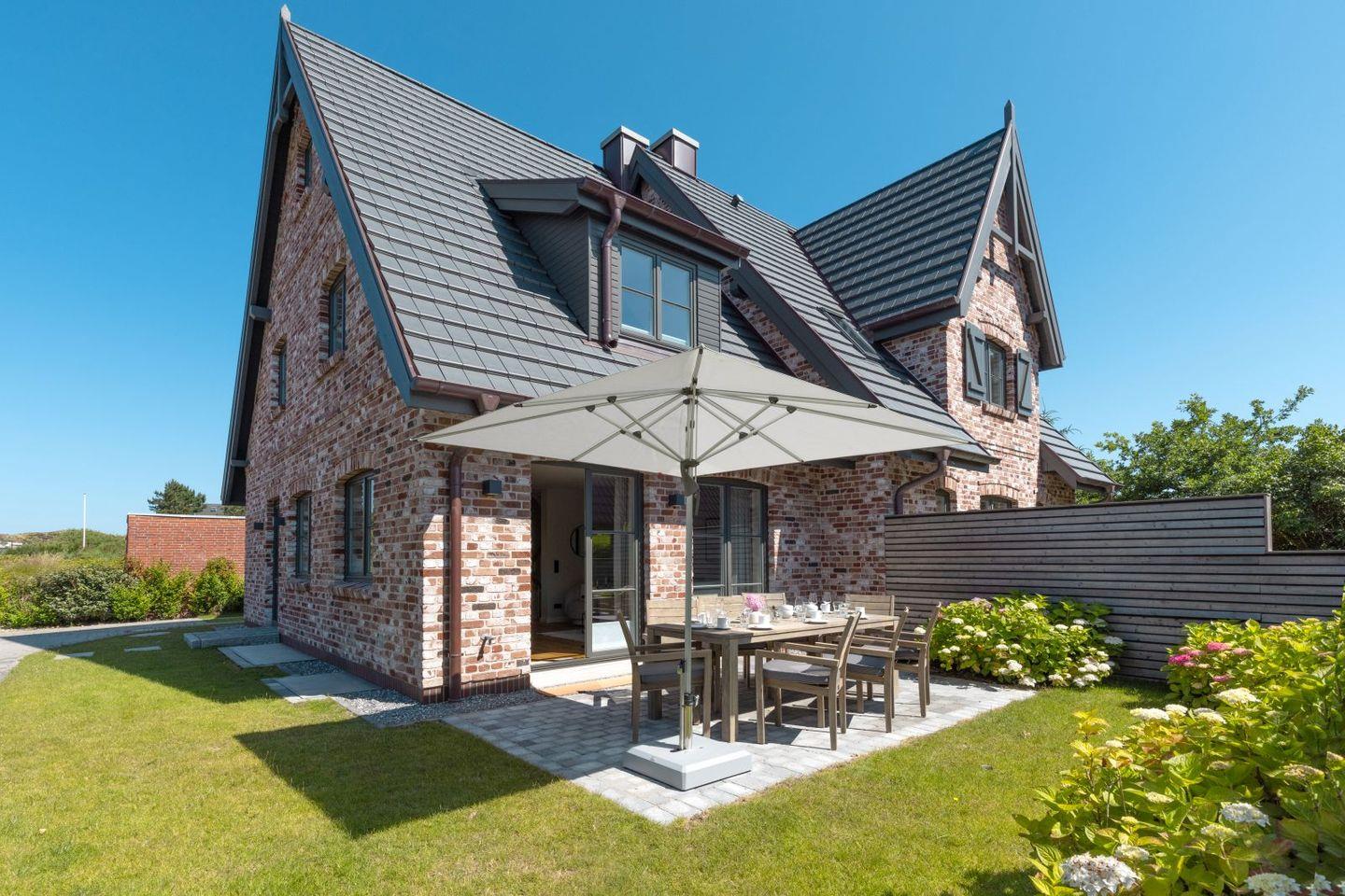 Luxuriöses Ferienhaus Gössi Hüs auf Sylt mit Sauna, Kamin, Terrasse und herrlichem Gartenblick.