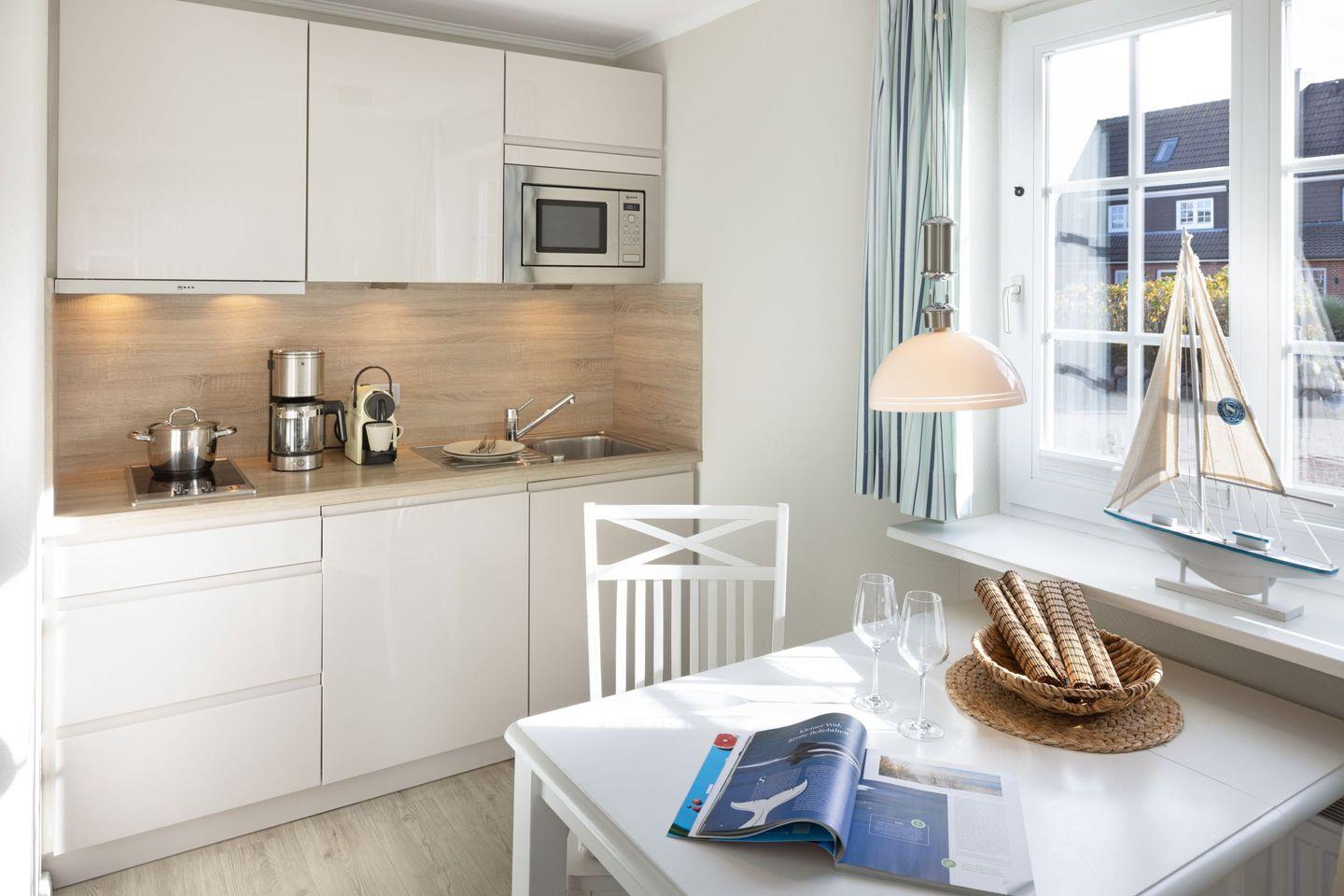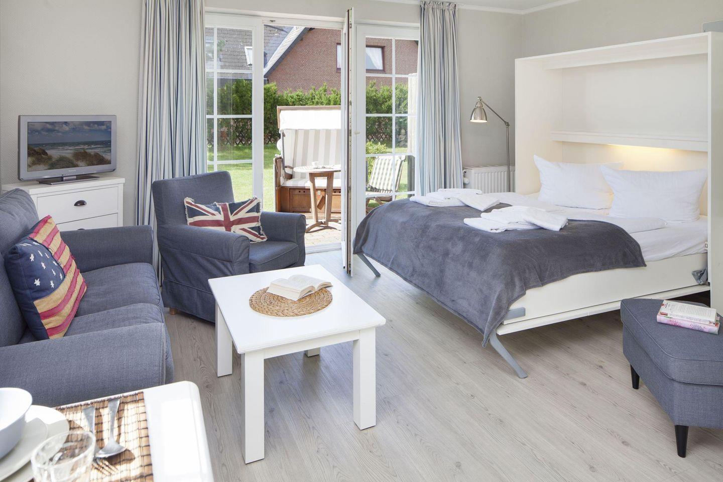 Die Ferienwohnung verfügt über einen hellen und einladenden Wohnbereich und Schlafbereich, der mit einem gemütlichen Sofa, einem Sessel und einem Schrankbett ausgestattet ist. Hier können Sie sich nach einem Tag voller Aktivitäten entspannen oder einen Film auf dem 25-34 Zoll Fernseher genießen. Der Essbereich eignet sich ideal für gemeinsame Mahlzeiten, während die Kochnische mit einem 2-Platten-Herd, Kühlschrank, Mikrowelle, Kaffeemaschine, Espressomaschine und weiteren Küchenutensilien ausgestattet ist, um Ihre Lieblingsgerichte zuzubereiten. Ein Brötchenservice sorgt dafür, dass Sie frisch gebackene Brötchen direkt zur Verfügung haben.