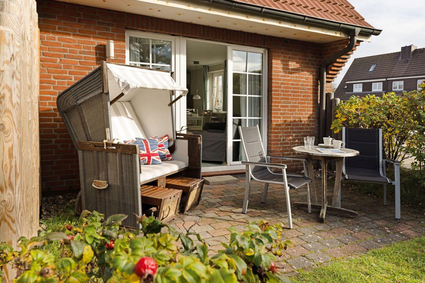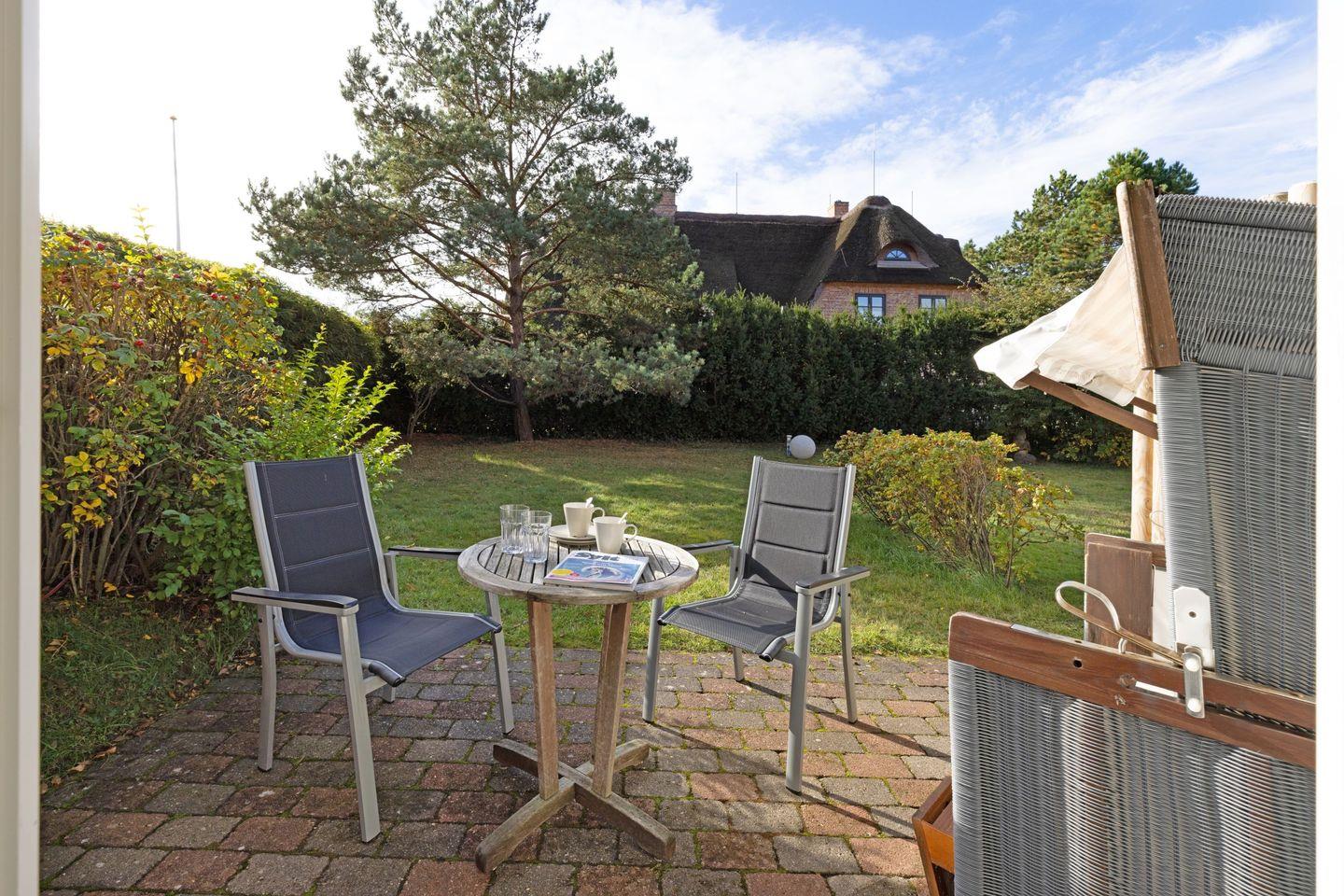 Eine große Besonderheit dieser Wohnung ist die private Terrasse, die mit Gartenmöbeln ausgestattet ist. Genießen Sie hier die frische Luft und die entspannende Atmosphäre, perfekt für ein Frühstück im Freien oder eine Tasse Kaffee am Nachmittag. Der Strand ist nur 1000 Meter entfernt, sodass Sie in kürzester Zeit die Sandstrände von Sylt erreichen können! Auf der Terrasse finden Sie auch einen Strandkorb – ideal, um die Sonne zu genießen und sich zurückzulehnen.