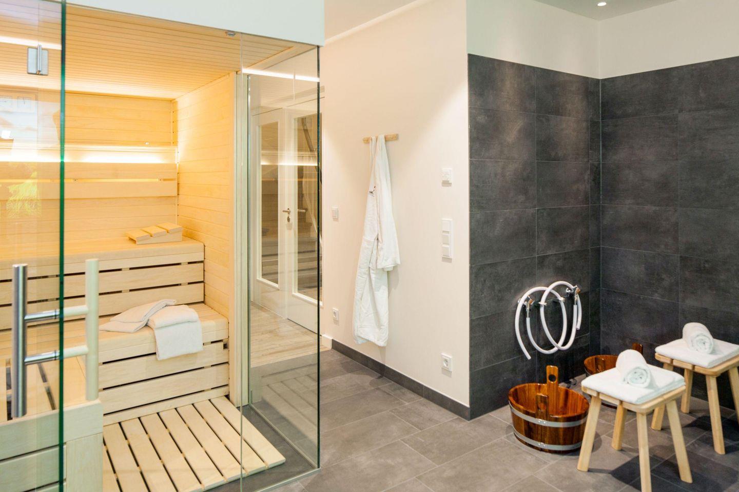 Luxuriöse Doppelhaushälfte unter Reet für bis zu 8 Personen mit Wellnesslandschaft, Fitnessraum und eigenem Kinoraum.