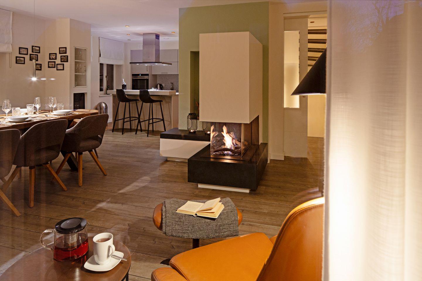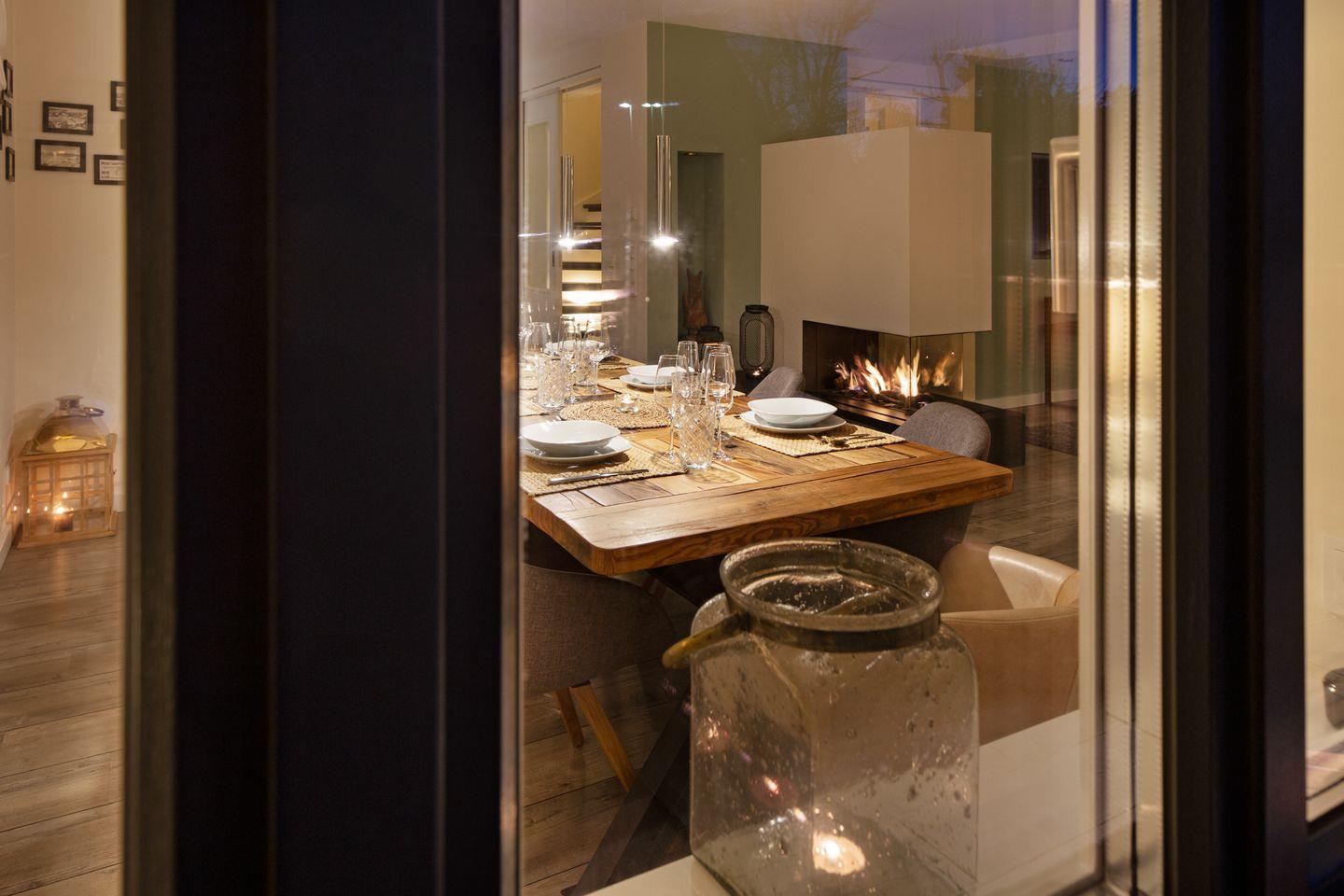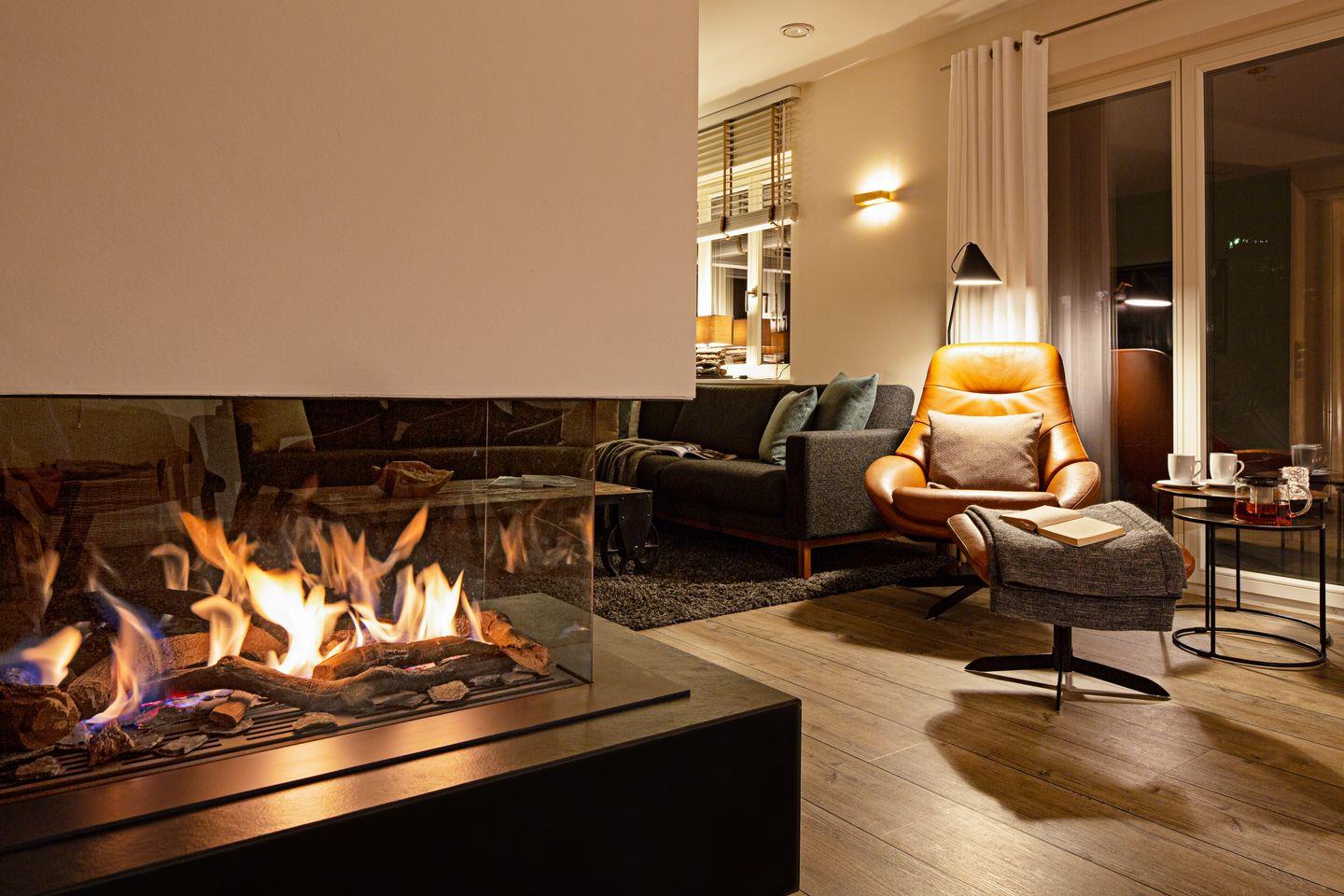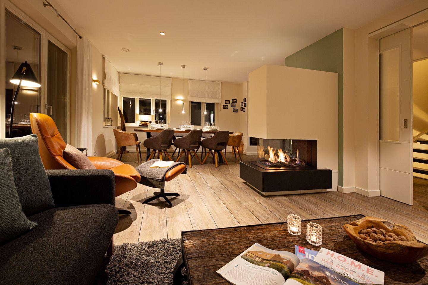 Ein zu drei Seiten offener Gaskamin verbindet den Wohnbereich im EG mit dem Esszimmer und der Küche.