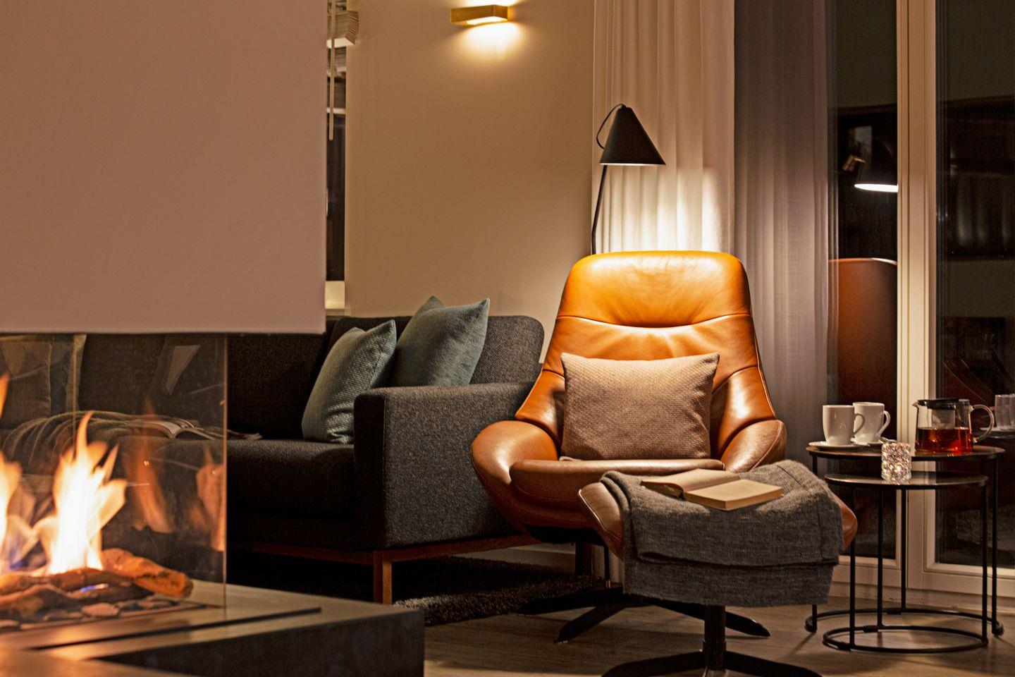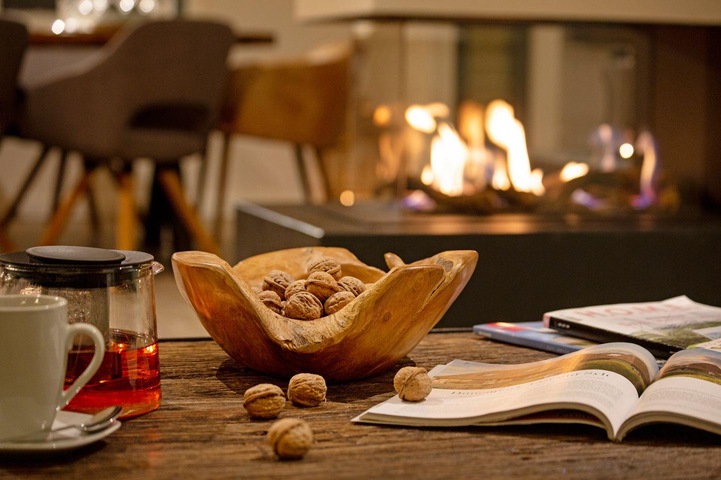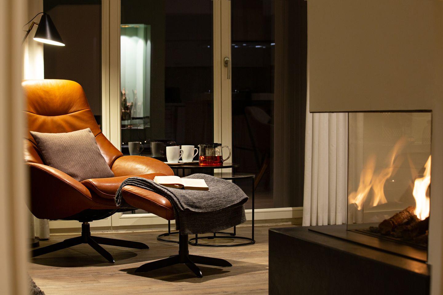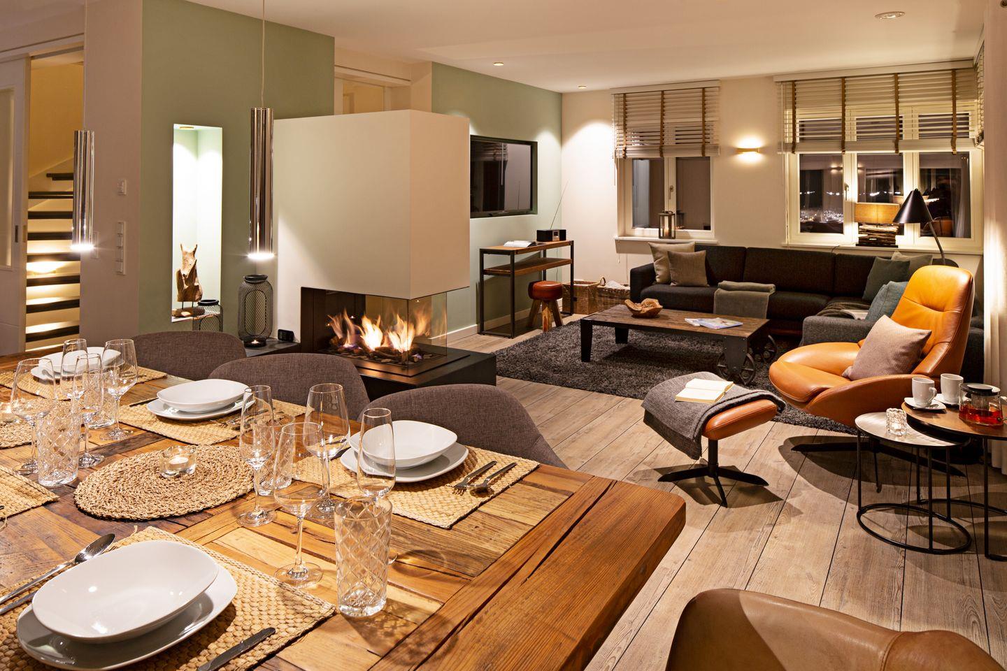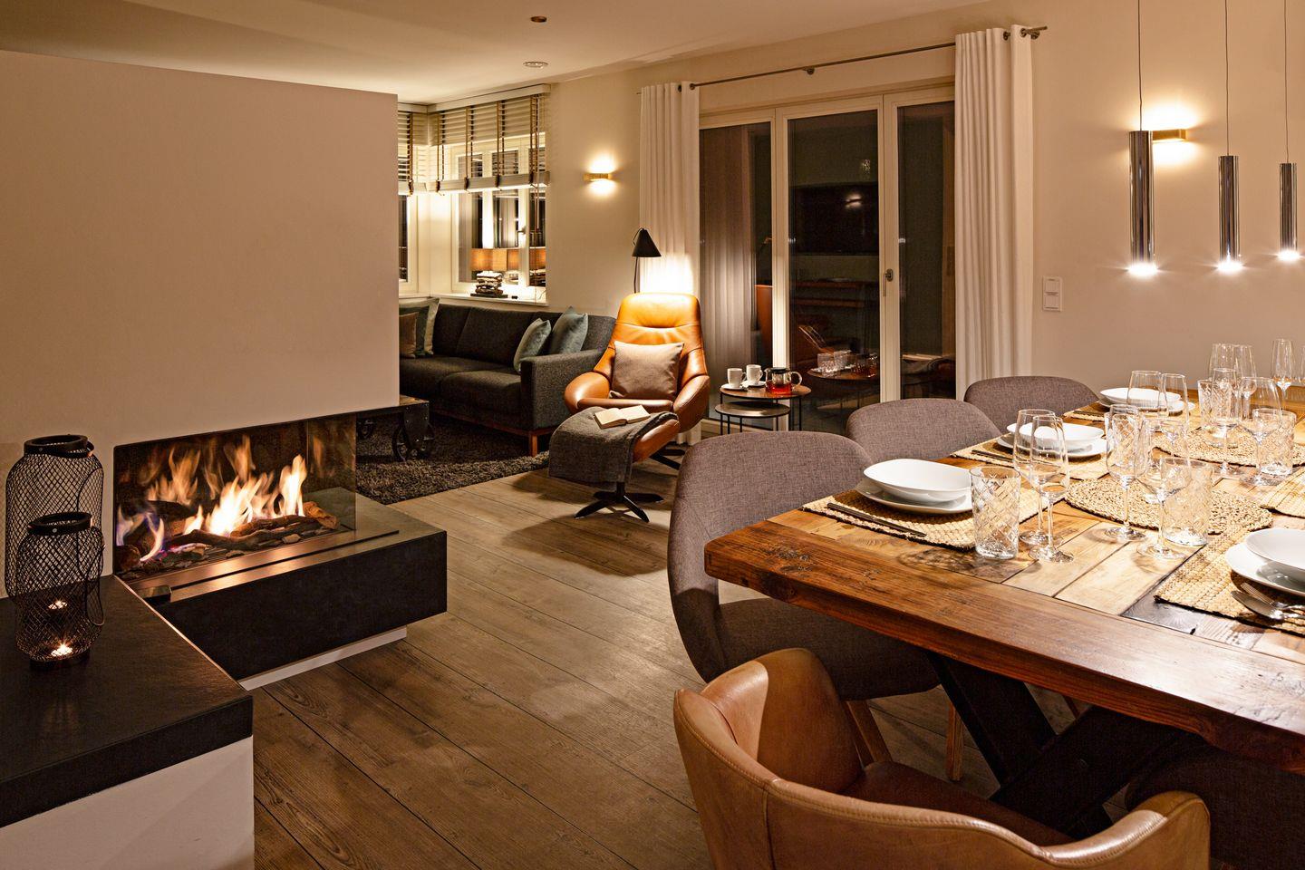 Ein zu drei Seiten offener Gaskamin verbindet den Wohnbereich im EG mit dem Esszimmer und der Küche.